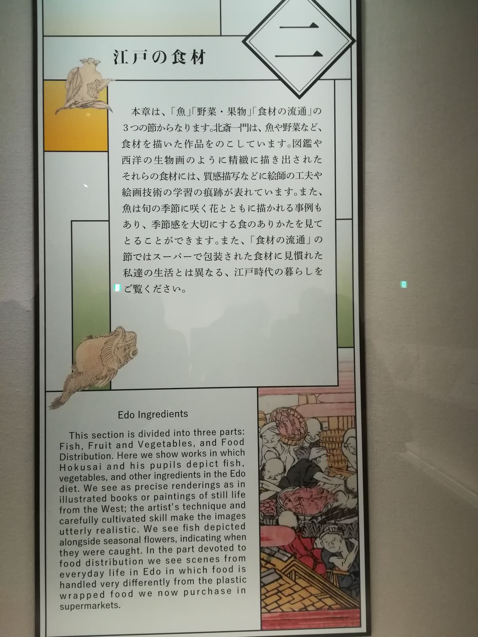 2章では、北斎一門が描いた、魚や野菜といった食材の浮世絵を展示。展覧会のメイン作品の1つである、リアルな描写の葛飾北斎「鮟鱇図」など、江戸の様々な食材が紹介されています。