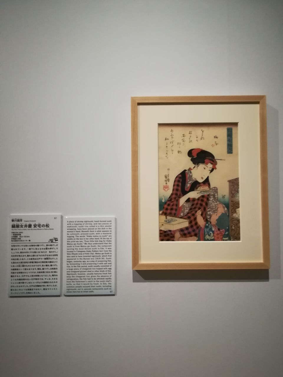 女性の手にする皿には海老の握り寿司、卵の巻き寿司が盛られています。この寿司は江戸で一番贅沢な寿司とも言われた 松ケ鮨のものだそうです