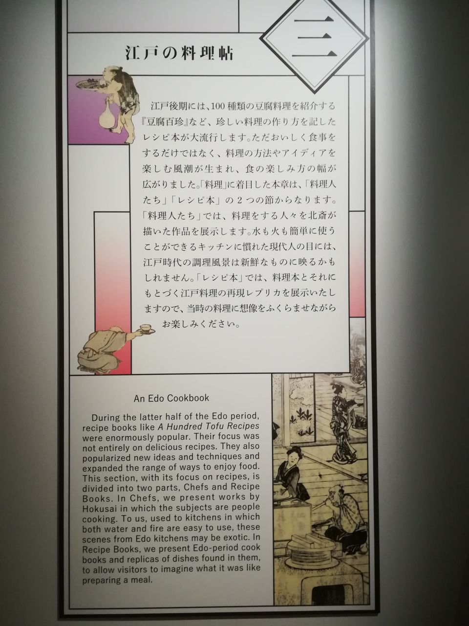 江戸後期には、様々な豆腐料理を紹介する『豆腐百珍』など、珍しい料理を紹介するレシピ本が大流行します。3章では、調理をする人が描かれた作品や、江戸の料理本とそれにもとづく江戸料理の再現レプリカの展示から、当時の調理や料理の様子を知ることができきます。