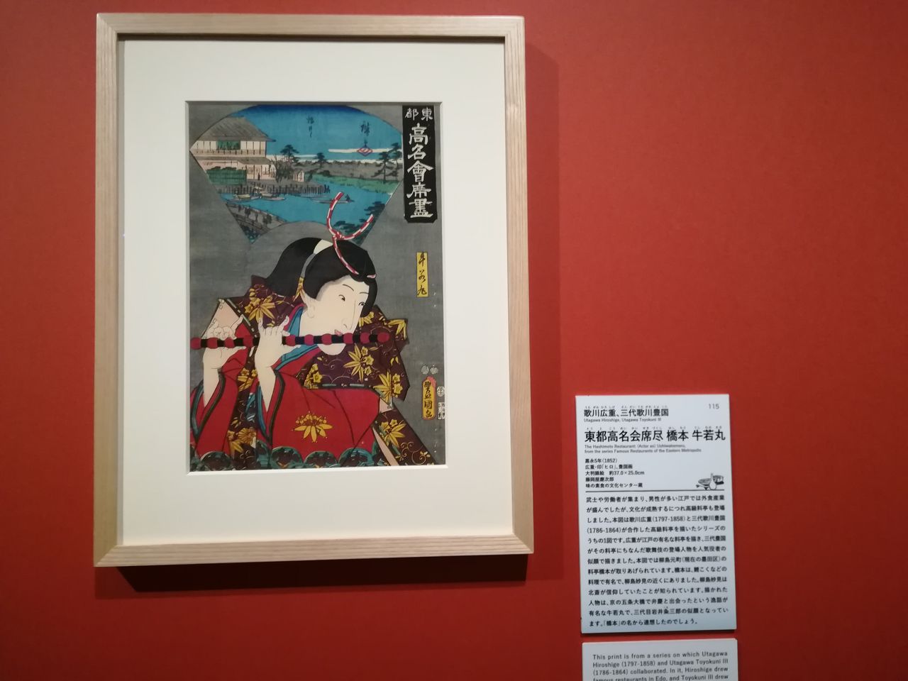 歌川広重と三代目歌川豊国が合作した高級料亭を描いたシリーズ「東都高名会席尽」 のうちのひとつです。ここでは柳島の料亭橋本が取り上げられています。 橋本は鯉こくなどの料理で有名でした。