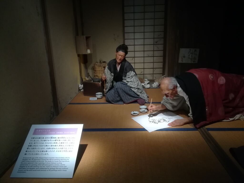 4階の常設展では、北斎が「日新除魔」を描いている場面を再現。こちらもお立ち寄りください。