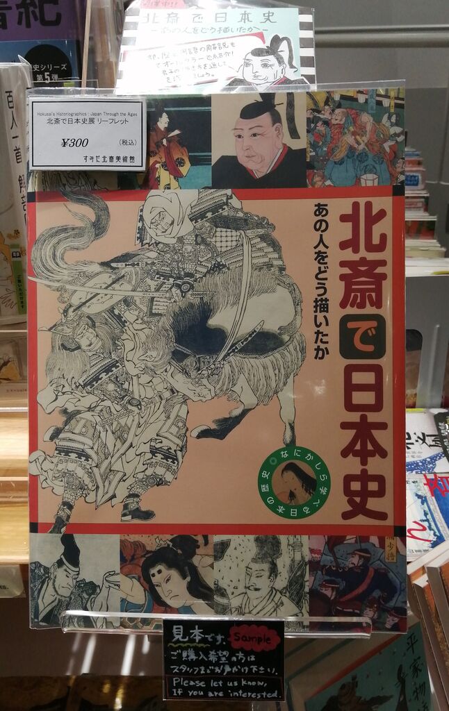 本展のリーフレットが1階ミュージアムショップにて販売中。日本歴史上の人物や事件が、北斎や弟子の作品にどのように描かれているのか、一部、歴史用語の解説も交えてオールカラーで紹介されています。(A4縦長・全8ページ)価格:300円(税込)