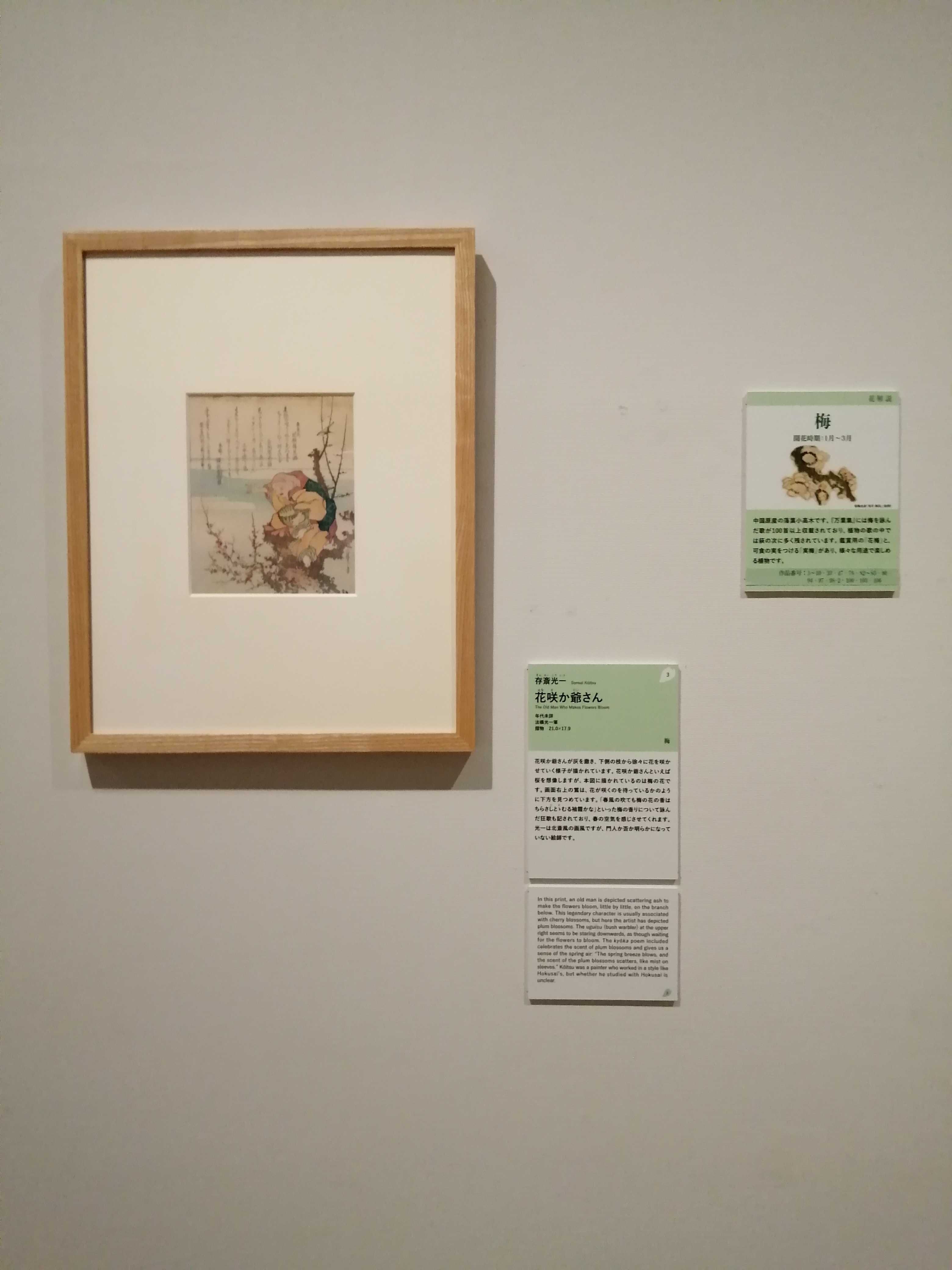 本図では灰を撒く花咲か爺さんの姿が描かれていますが、桜ではなく梅の花が描かれ、画面左上には、梅の香りや春の訪れへの期待が詠まれた狂歌が添えられています。