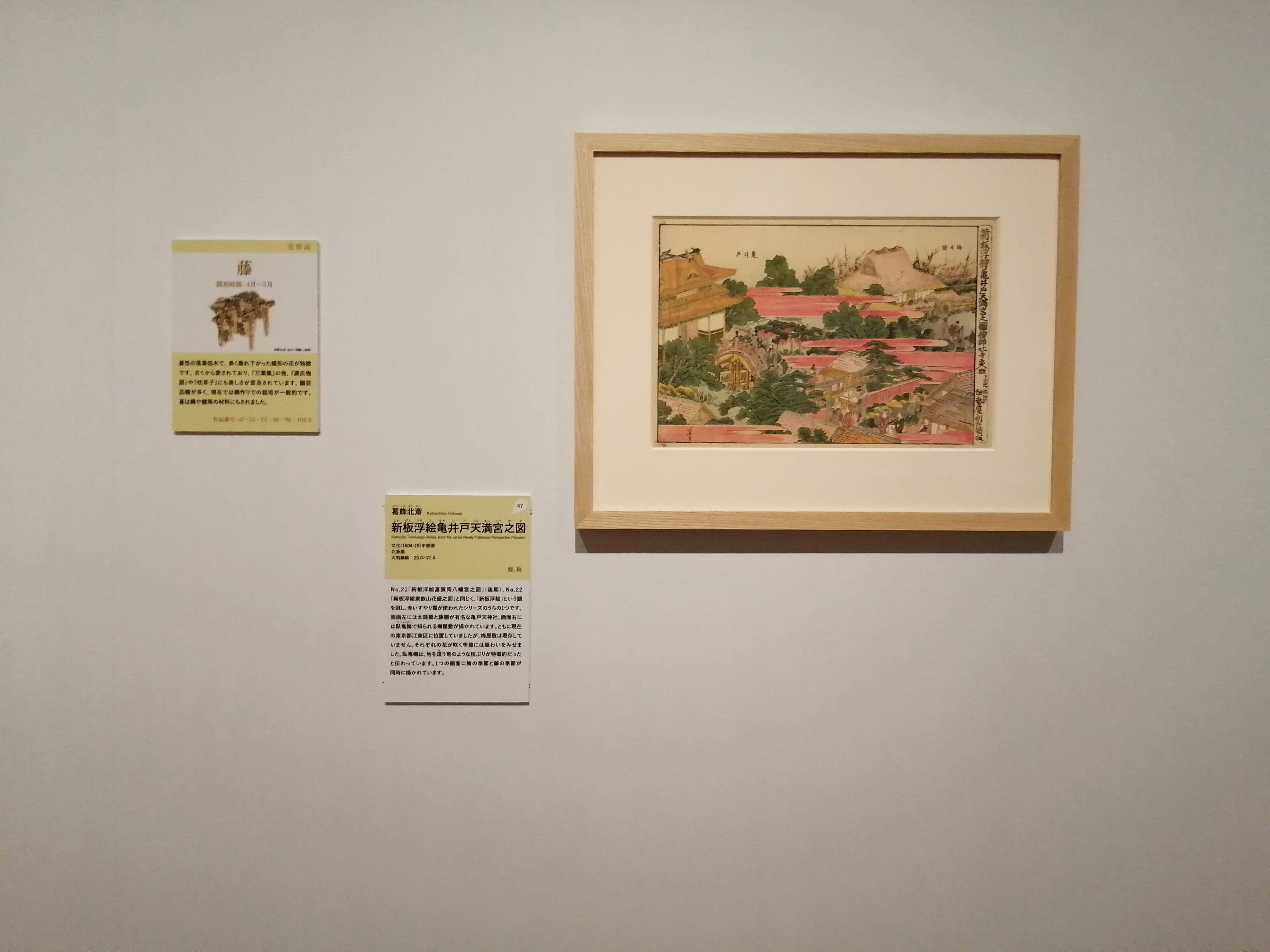 画面左には太鼓橋と藤が有名な亀戸天神社、画面右には梅屋敷が描かれ、1つの画面に開花時期の異なる梅と藤が同時に描かれています。