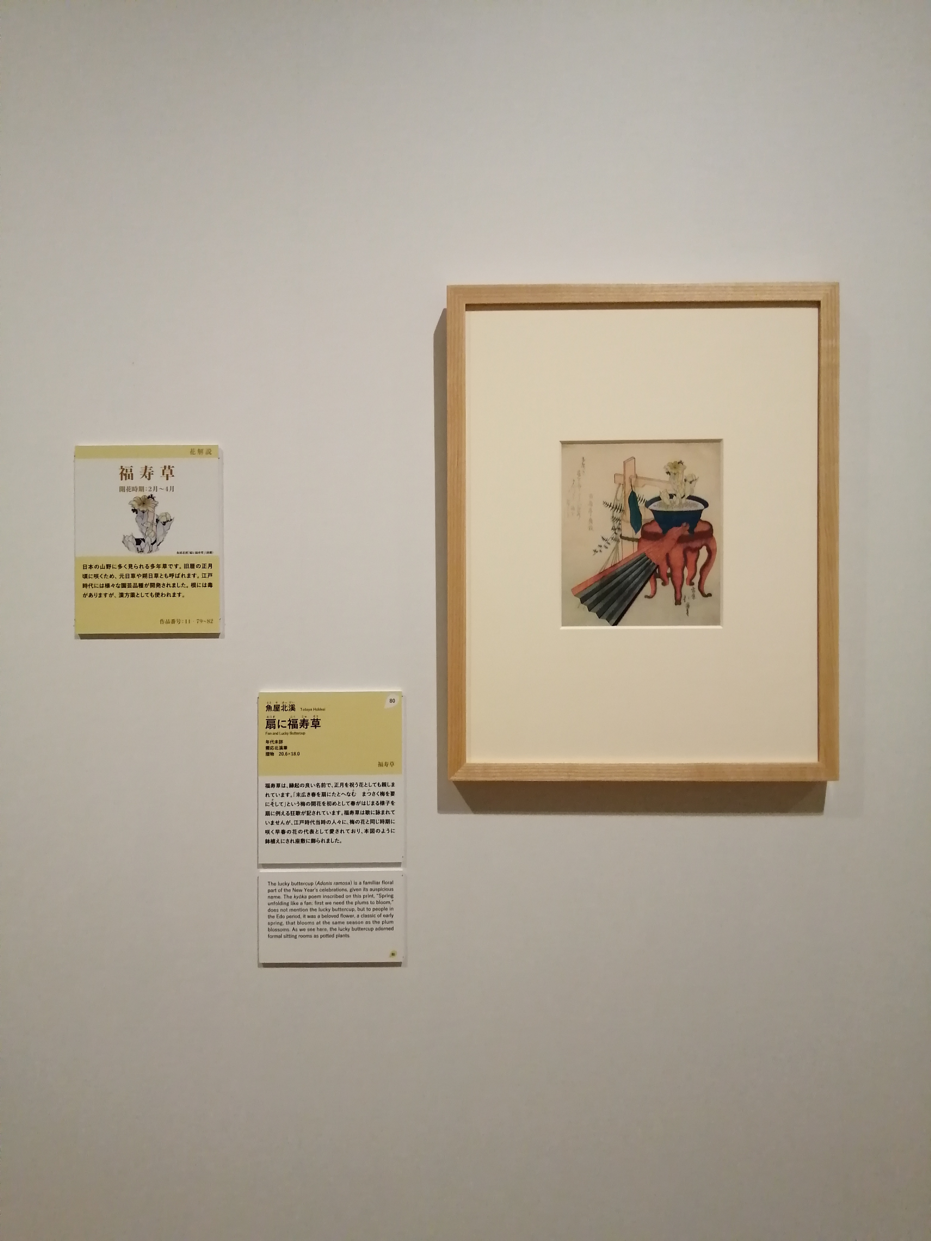 鉢植えに入れられ、座敷に飾られた福寿草を描いた作品。福寿草は旧暦の正月頃に咲き、正月を祝う花として江戸時代の人々に愛されました。