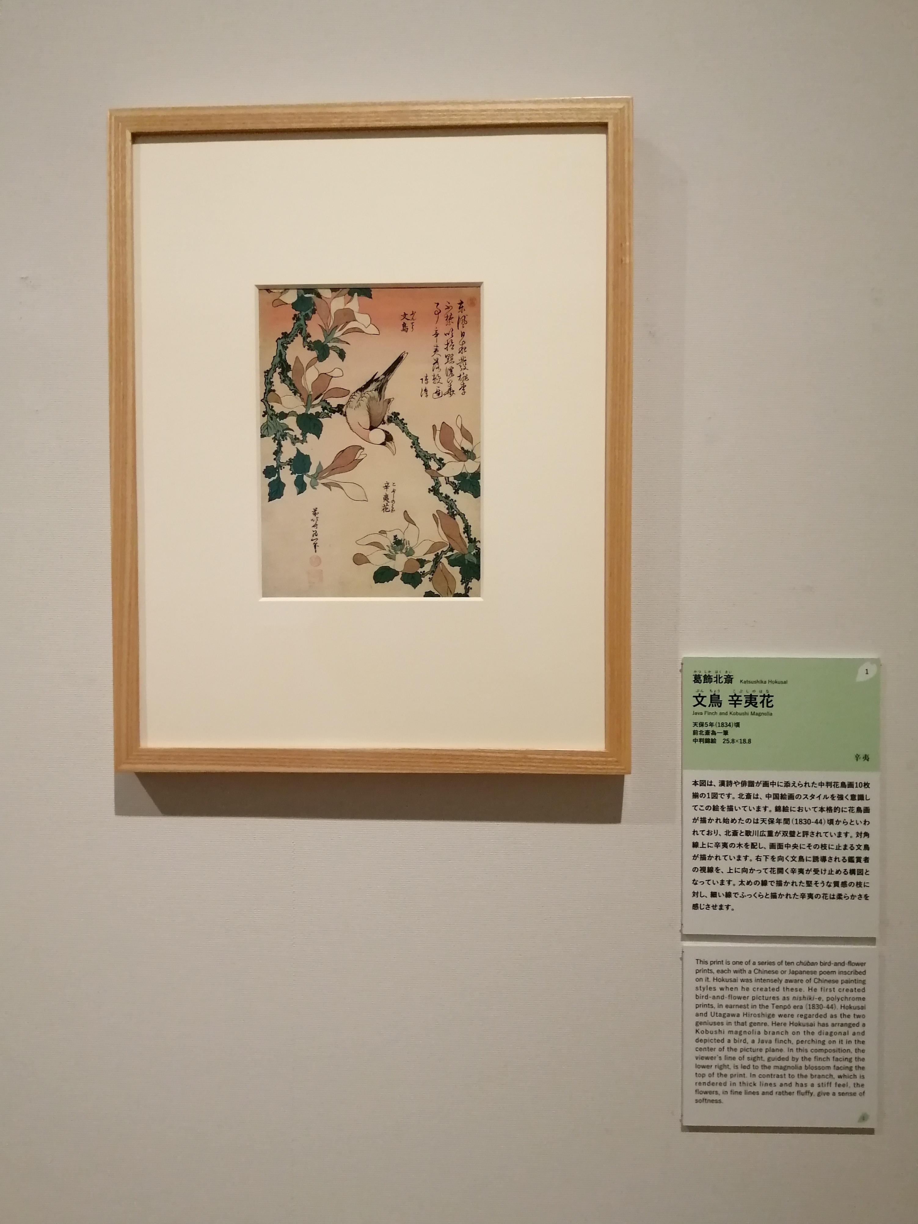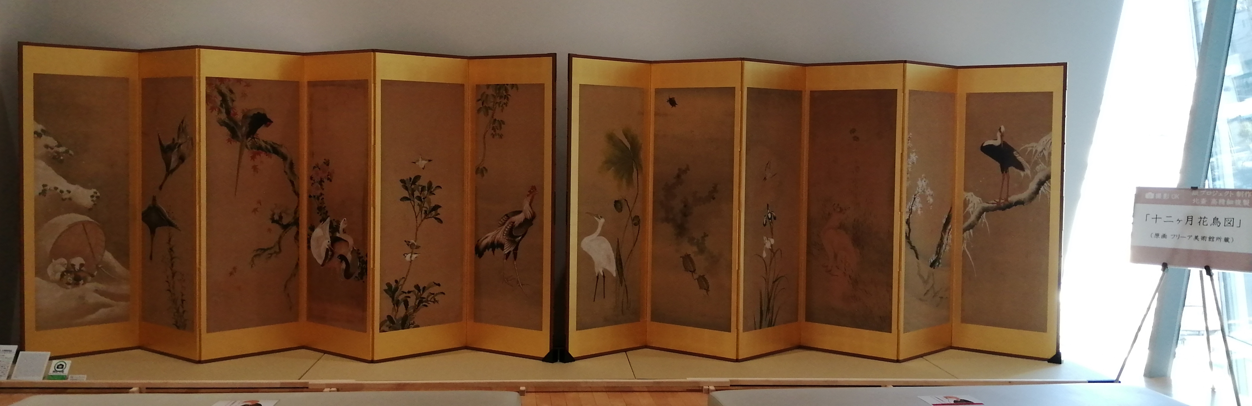 3階ホワイエでは、綴プロジェクト制作の高精細複製画「十二ヶ月花鳥図」(画:アメリカ・フリーア美術館蔵)が特別展示。撮影も可能です。右から順に1月から12月までの各月に対応する花鳥図が描かれています。落款がないことから作者について議論もありましたが、精緻な描写や動物たちの姿から現在では北斎の作品と考えられています。展示は2022年5月22日(日)まで。