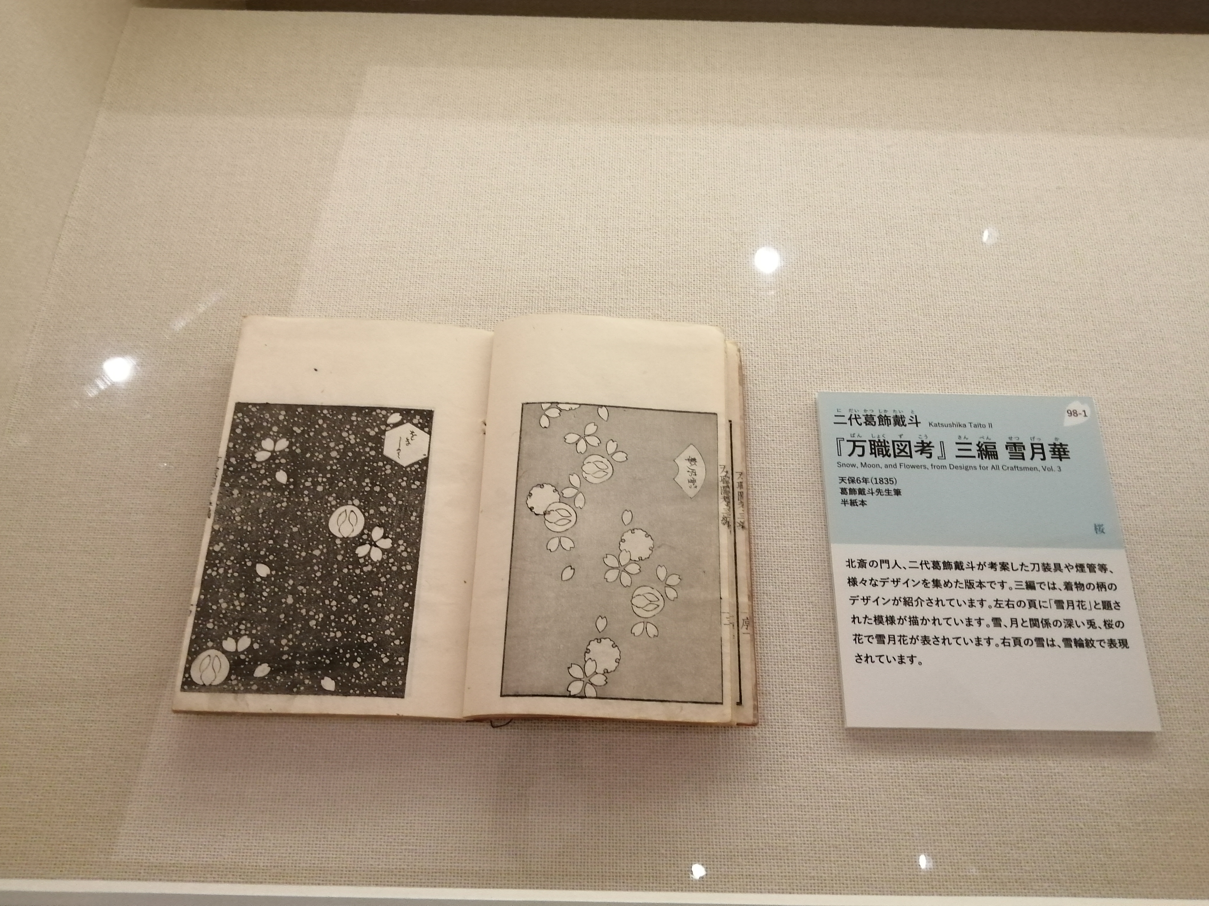 『万職図考』は北斎の門人、二代葛飾戴斗が考案した刀装具や煙管等、 様々なデザインを集めた版本です。三編では、着物の柄の デザインが紹介されています。雪、月と関係の深い兎、桜の花で雪月花が表されています。