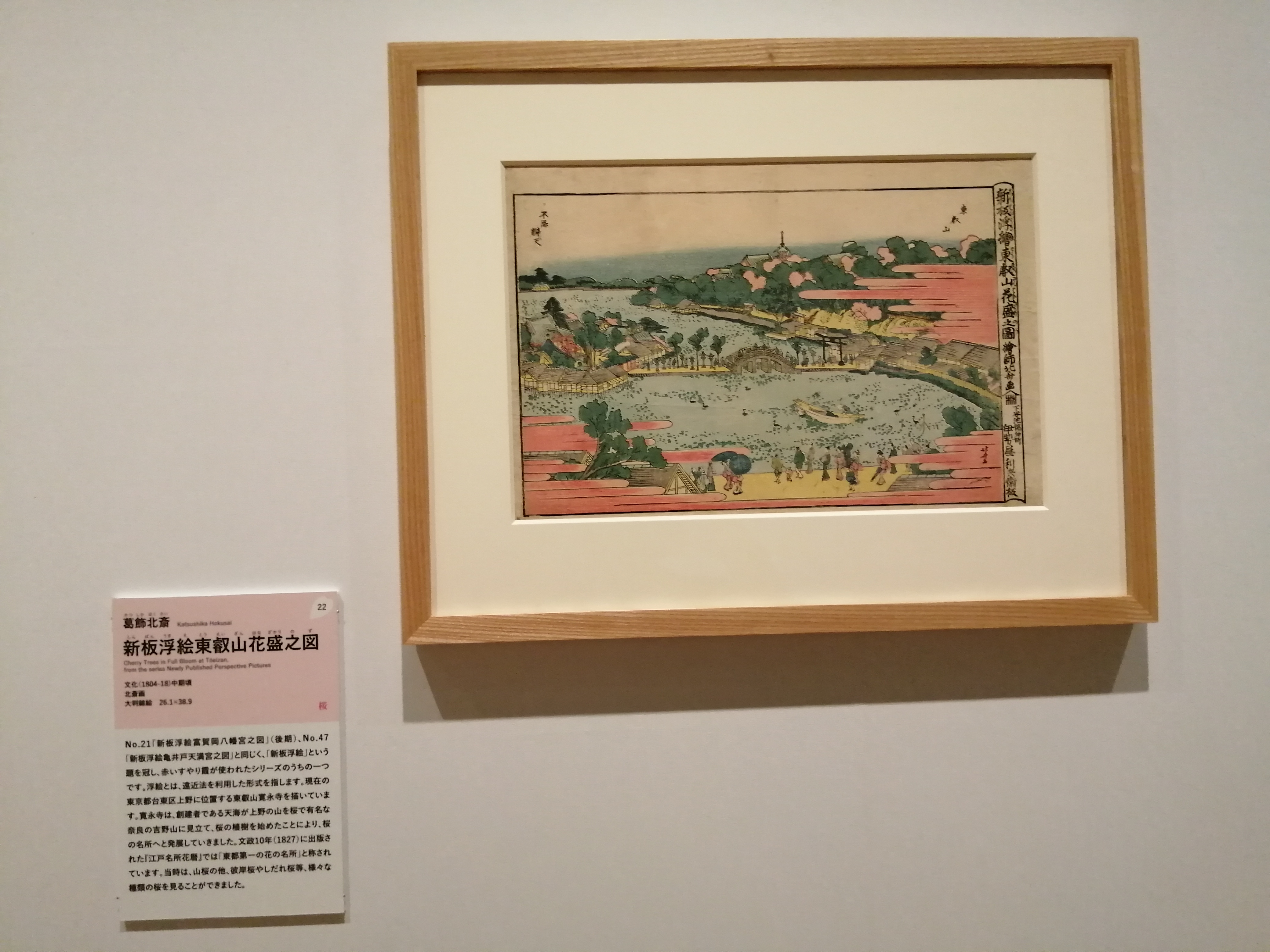 「新板浮絵」という、赤いすやり霞が使われたシリーズのうちの一つです。浮絵とは、遠近法を利用した形式のこと。現在の 東京都台東区上野に位置する東山寛永寺を描いています。『江戸名所花暦』では「東都第一の花の名所」と称されました。
