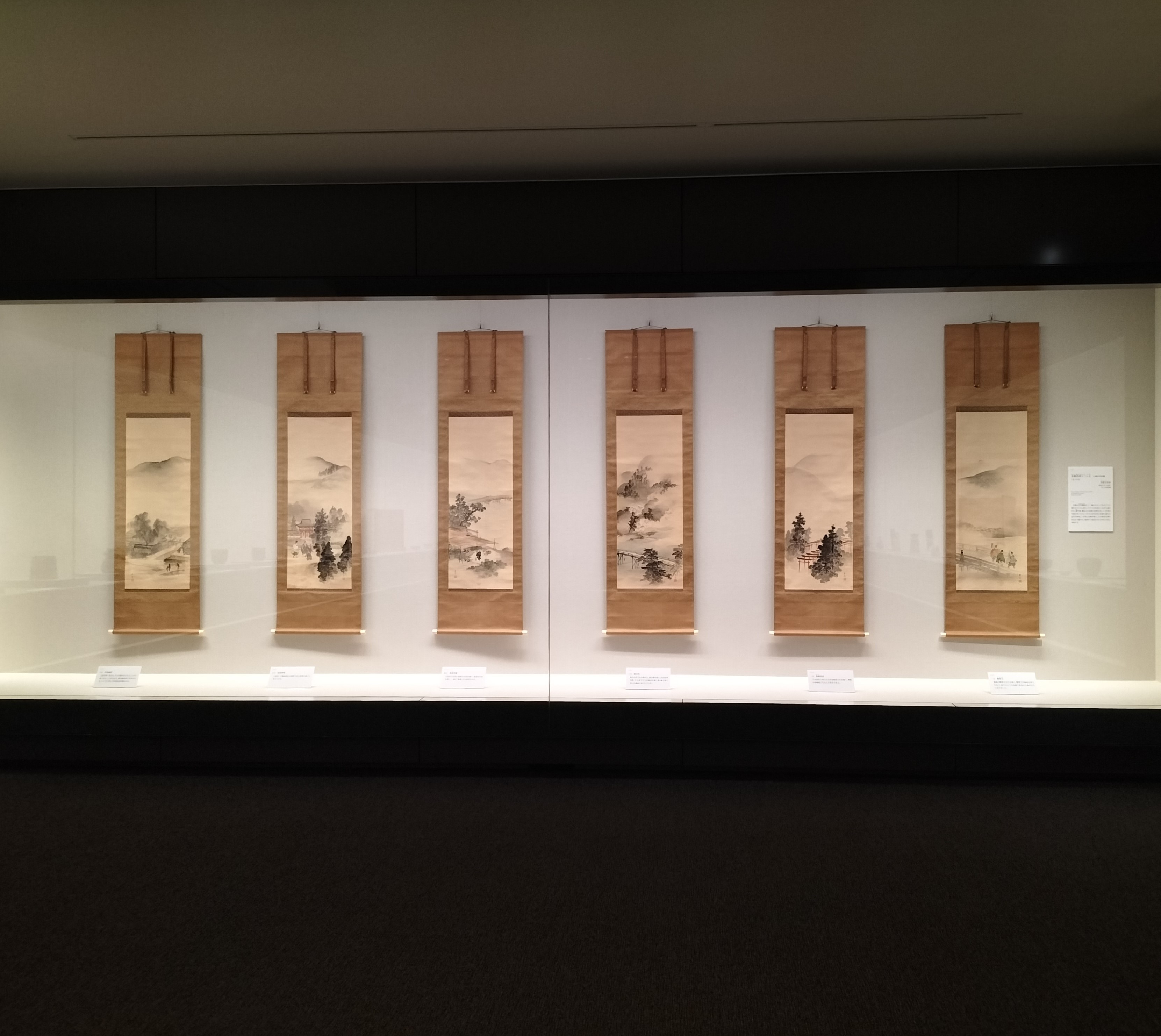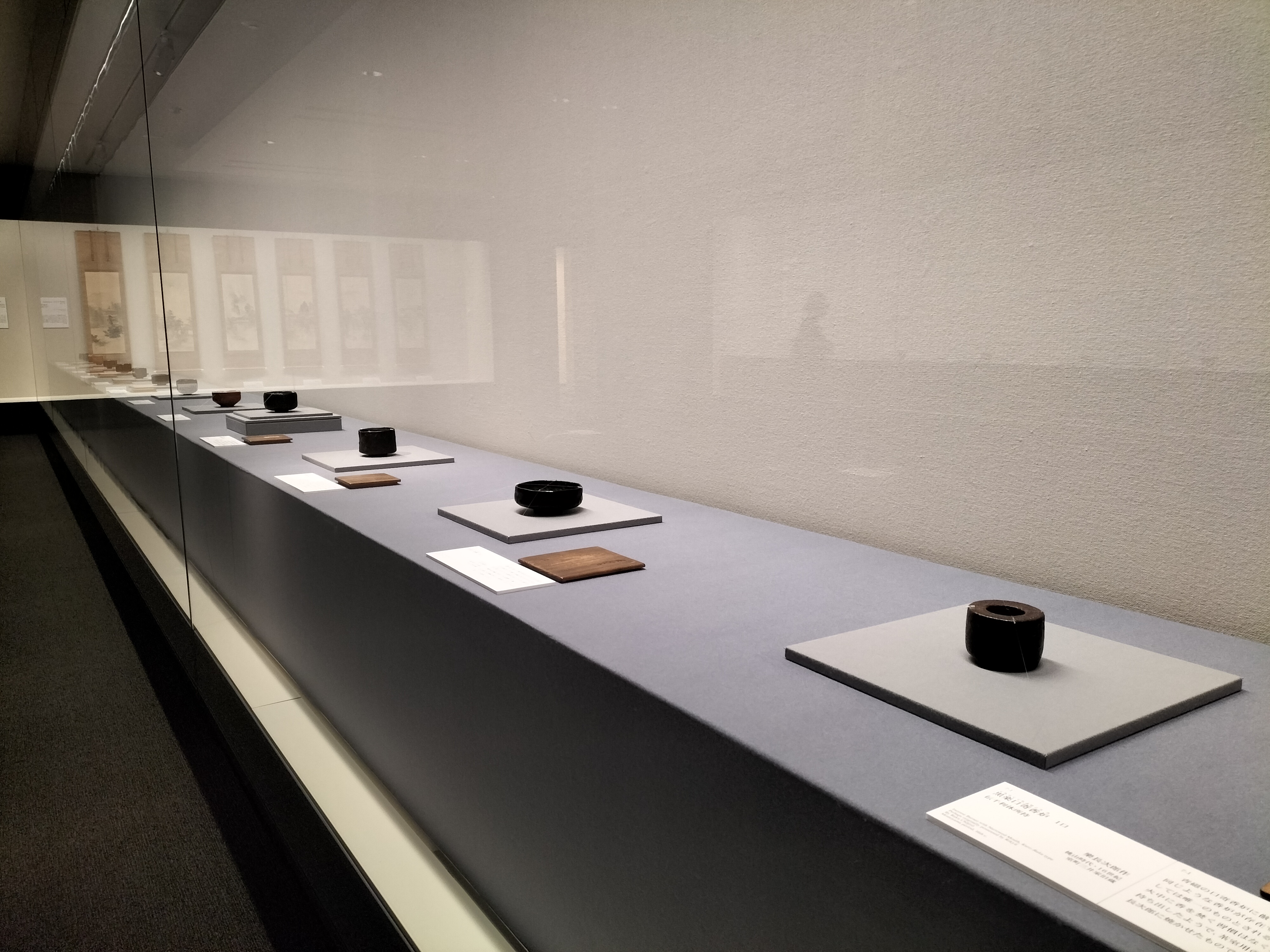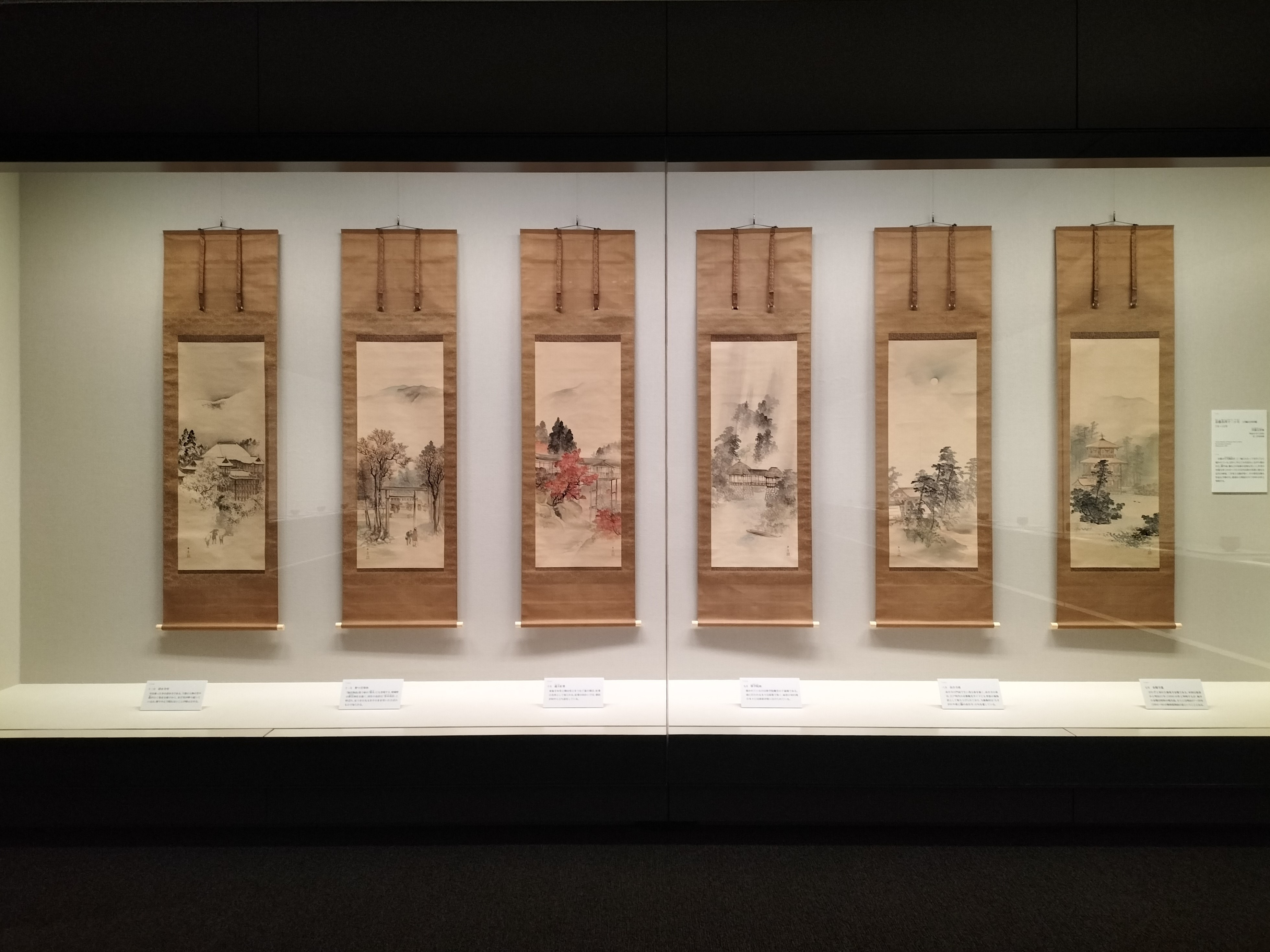 展示室7では、展示室4に引き続き、正面ケースに川端玉章(1842~1913)の京都名所十二ヶ月のうち、7月から12月までを展示。その右側のケースには楽茶碗、右側のケースには紀州御庭焼の作品が並びます。