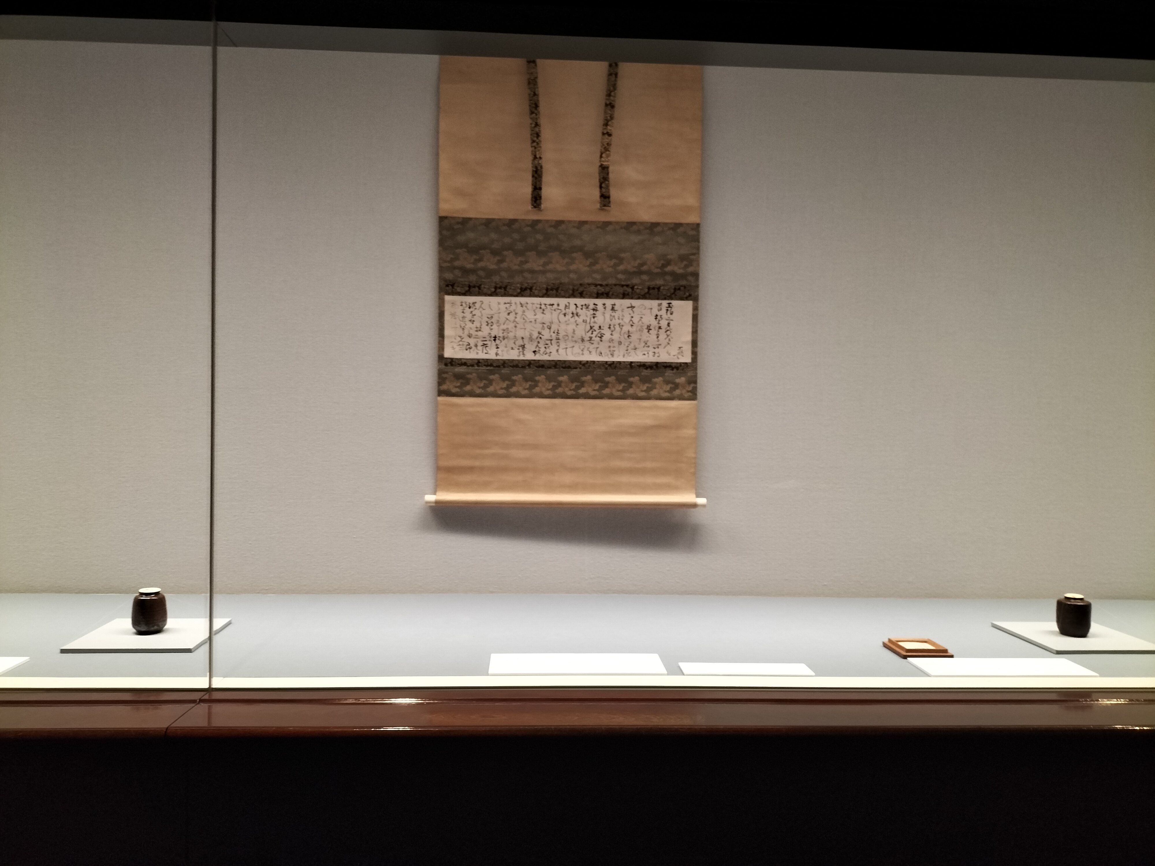 如庵ケースは、茶道具の取り合わせを展示。床には織田有楽最晩年の消息。茶碗は、有楽所持として伝わる高麗茶碗の大井戸茶碗です。