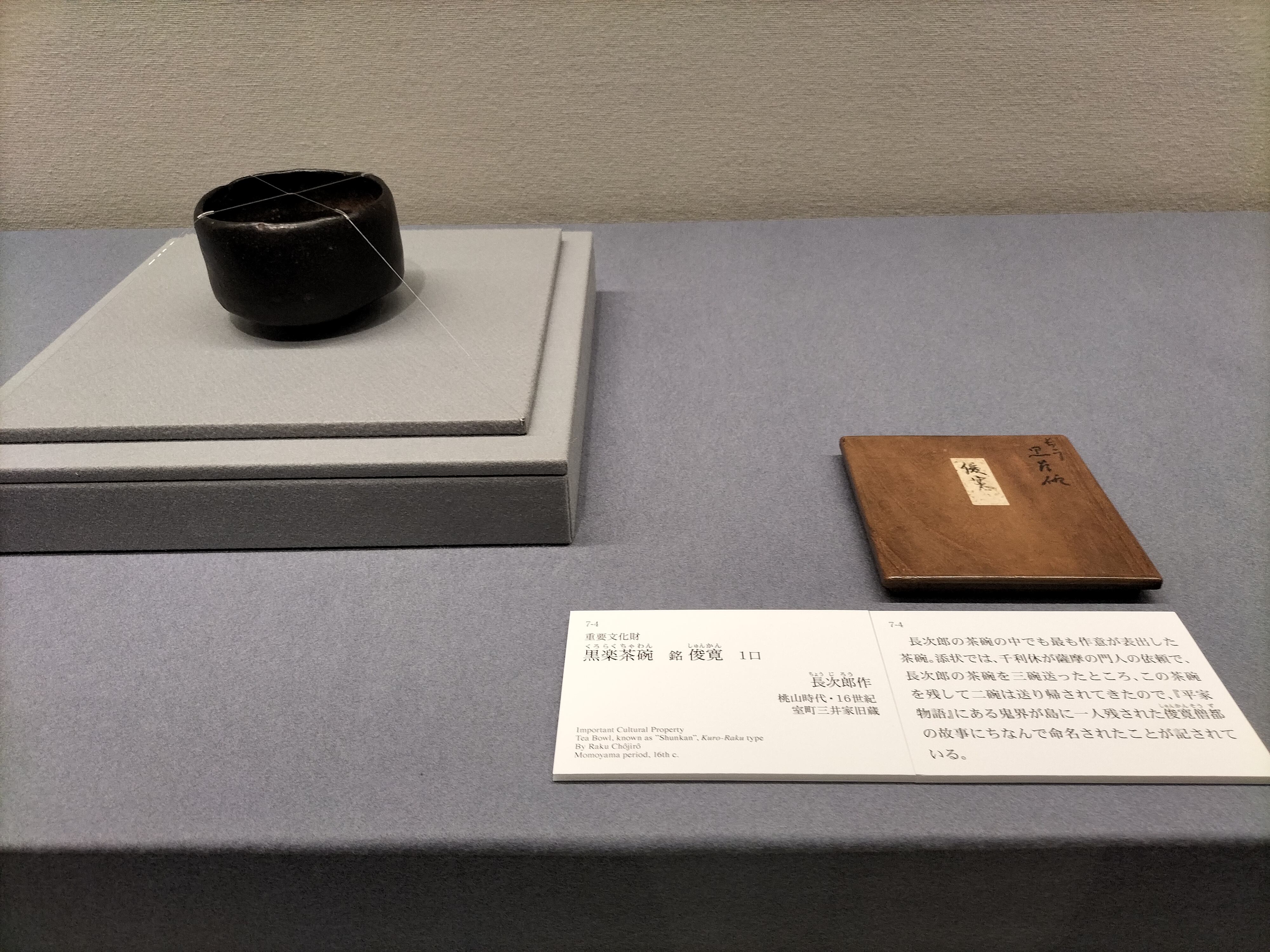 本作は、樂家初代長次郎の作品である黒楽茶碗、銘「俊寛」。添状では、千利休が薩摩の門人の依頼で、長次郎の茶碗を三碗送ったところ、この茶碗を残して二碗は送り返されてきたので、『平家物語』にある鬼界島に一人残される俊寛の故事にちなんで命名されたと記されています。