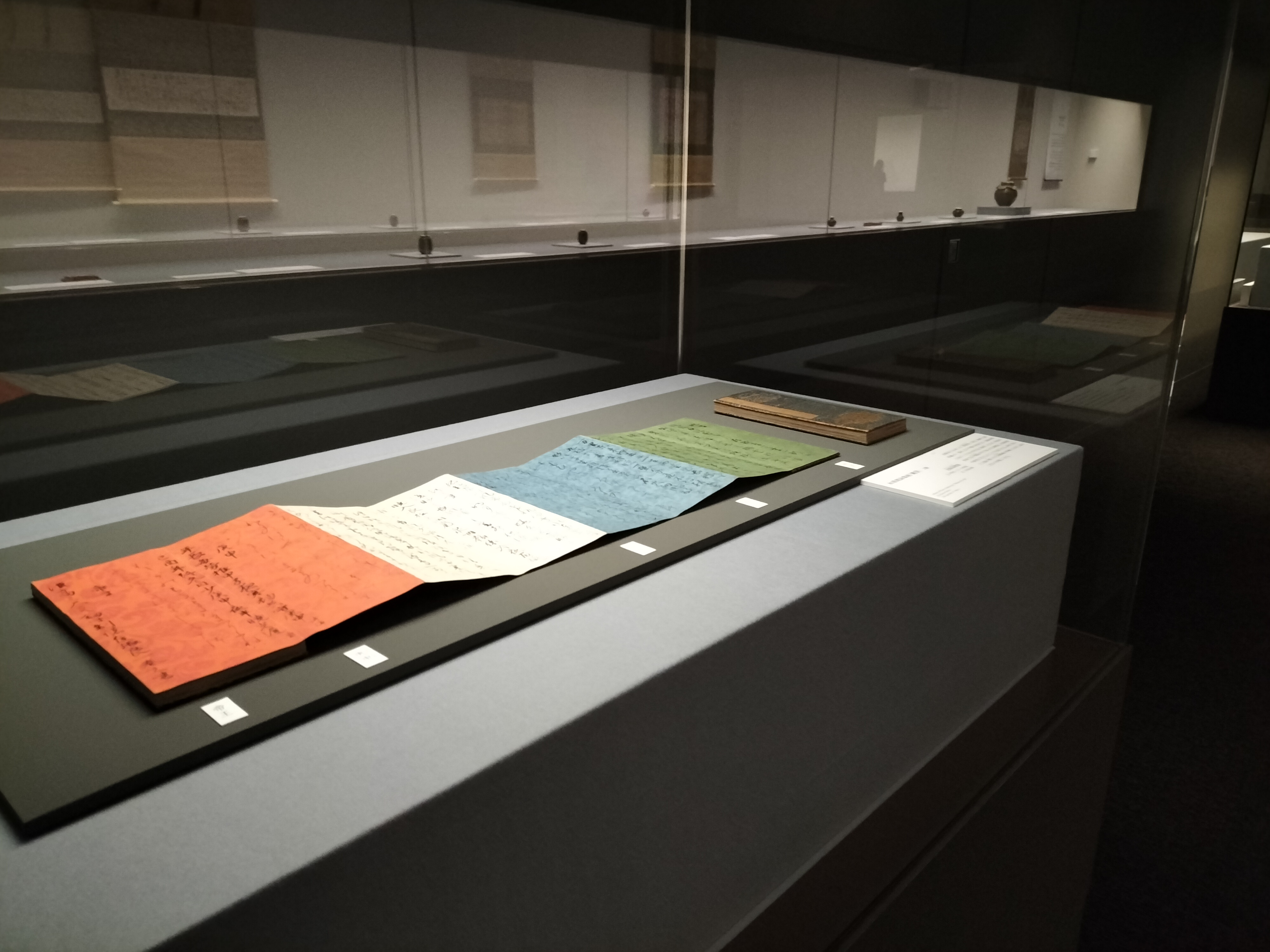 写真中央は、藤原行成筆とされる雲紙和漢朗詠集の古筆切で、千利休所持として伝わったもの。