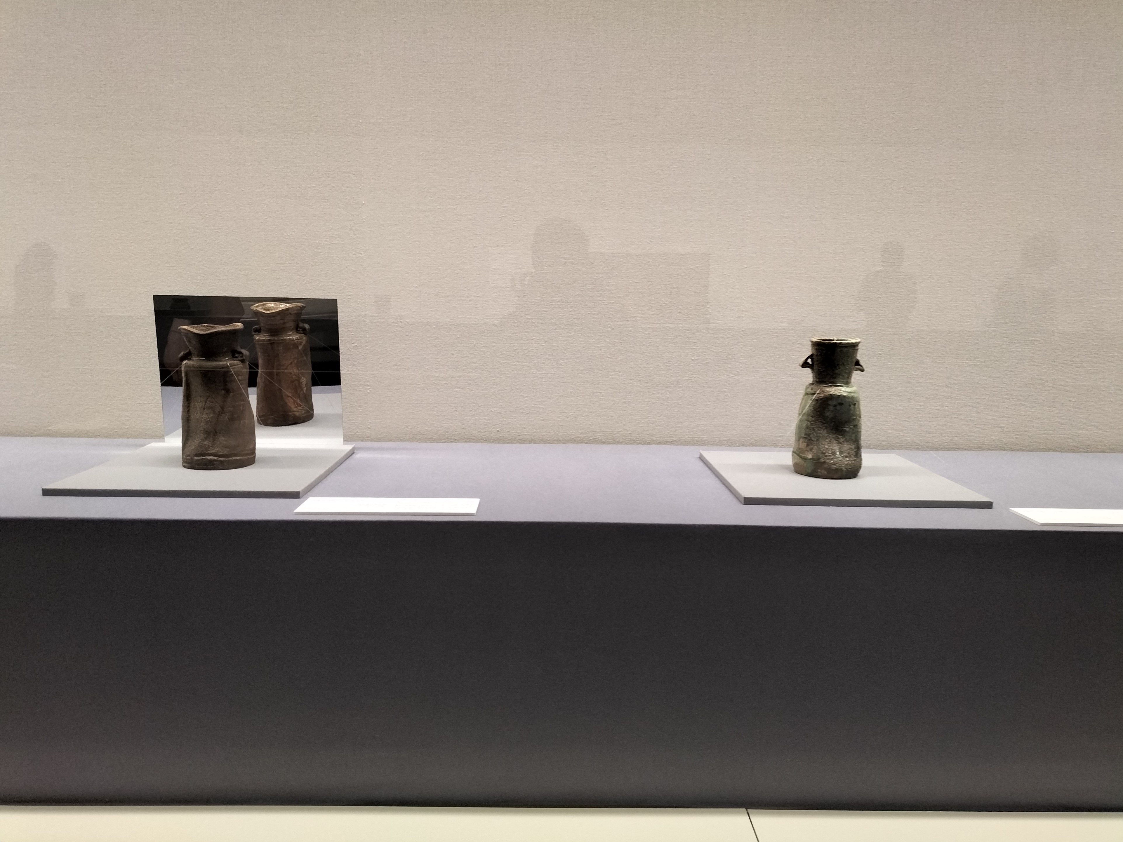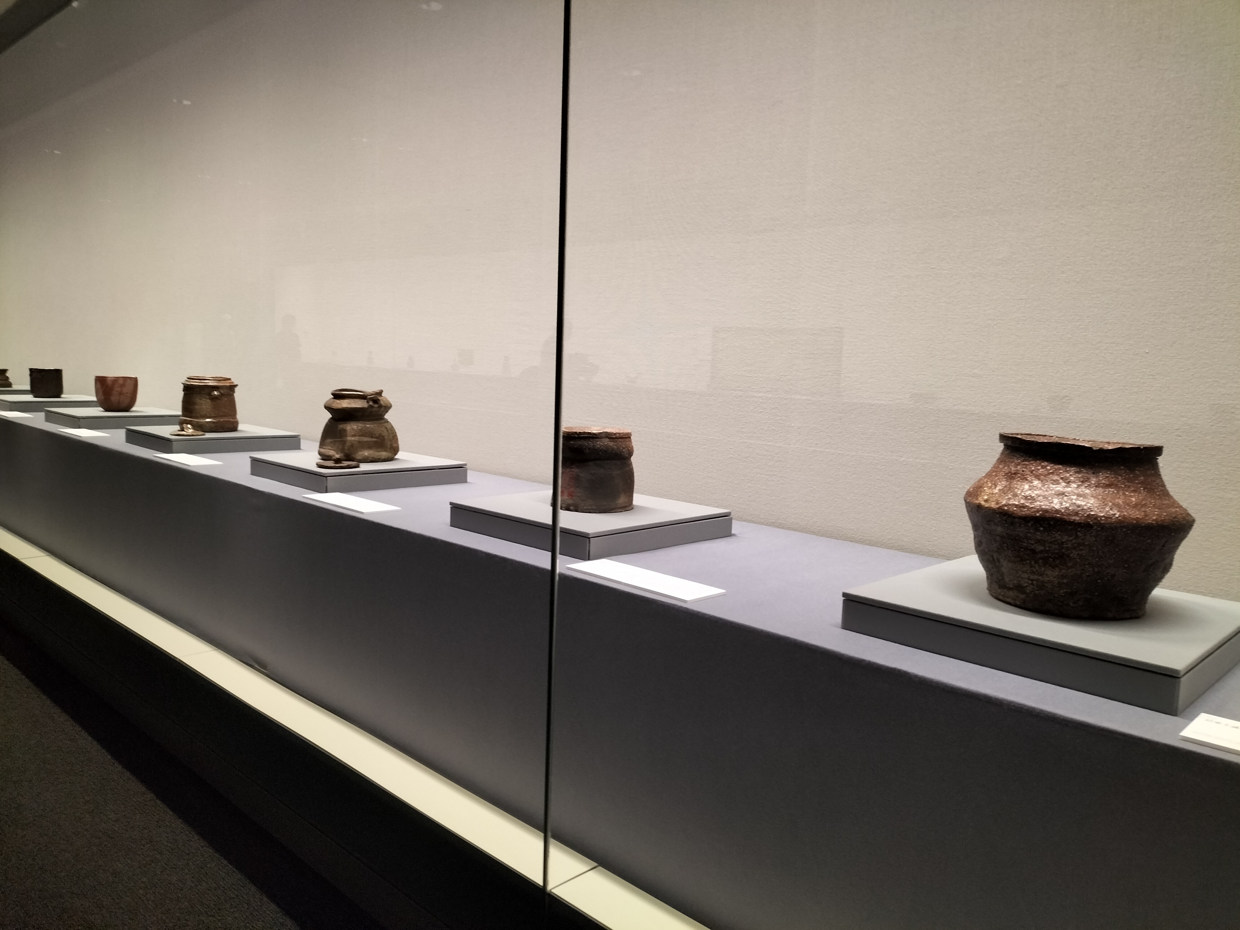 展示室4の正面ケースには川端玉章の京都名所十二ヶ月のうち、1月から6月までを展示。その右側のケースでは花入と水指、左側のケースでは水指と建水が展示されています。作品は、和物の信楽・備前・瀬戸・伊賀・仁清、そして南蛮物。