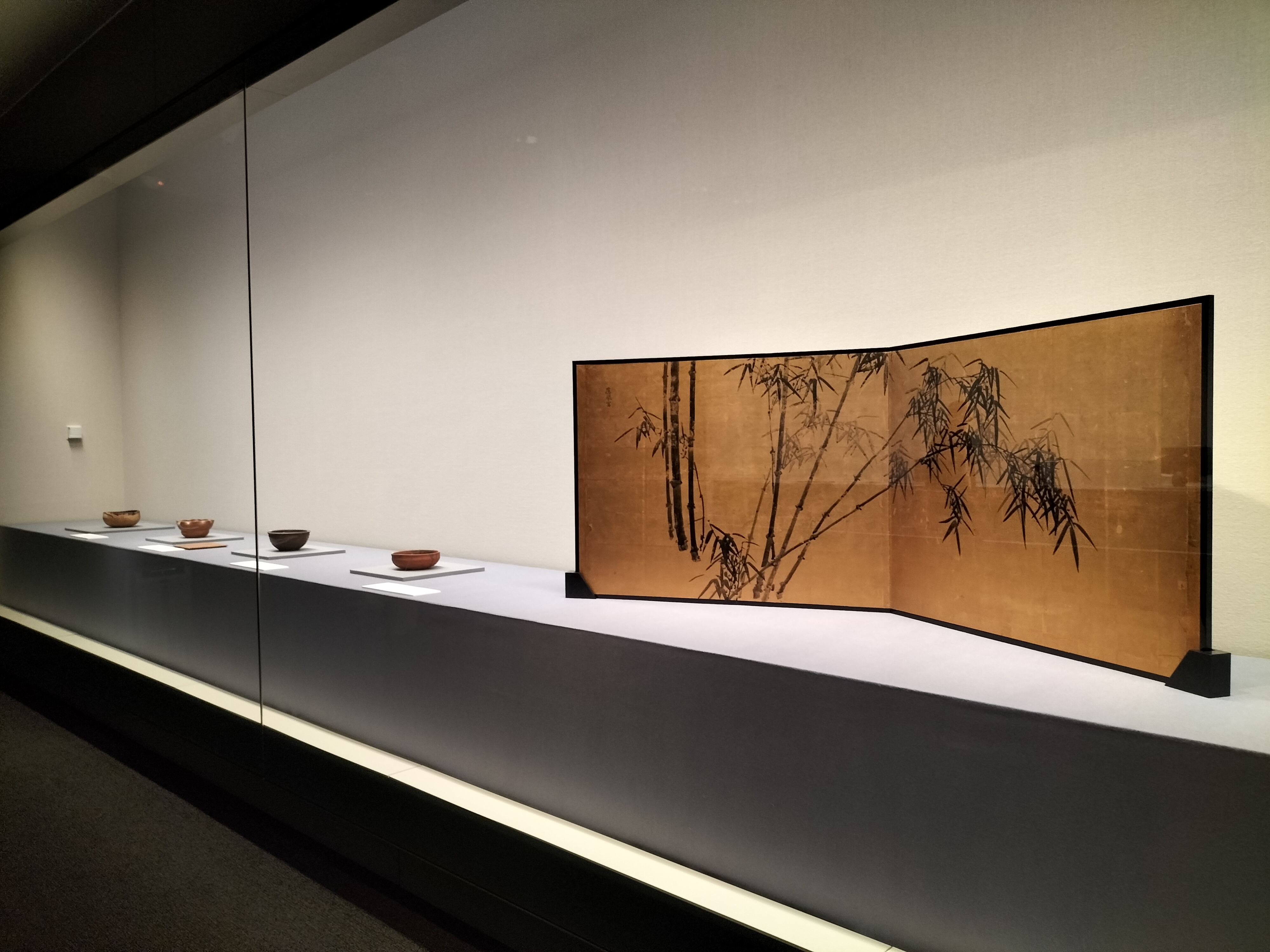 右:「竹図風炉先屏風」 2曲1隻 円山応挙 江戸時代・18世紀と建水の展示
