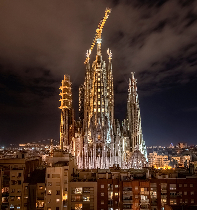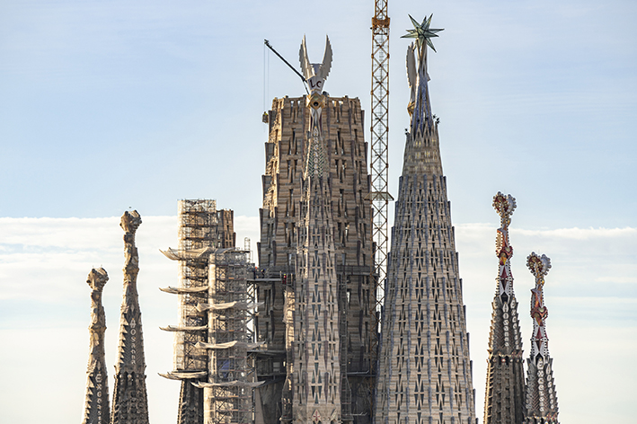 サグラダ・ファミリア聖堂の建設は、新型コロナウイルスの影響で一時中断していましたが、2020年の秋には再開。翌年の12月には、聖堂の中央に位置する6つの塔のうち、頂点に星を頂くマリアの塔が完成、続く2022年12月には4つの福音書作家の塔のうち、ルカとマルコの塔が完成しました。建設作業は現在も進んでおり、残るマタイとヨハネの塔は2023年11月に、聖堂中央の最も高い塔となるイエスの塔は2026年までの完成を予定しています。