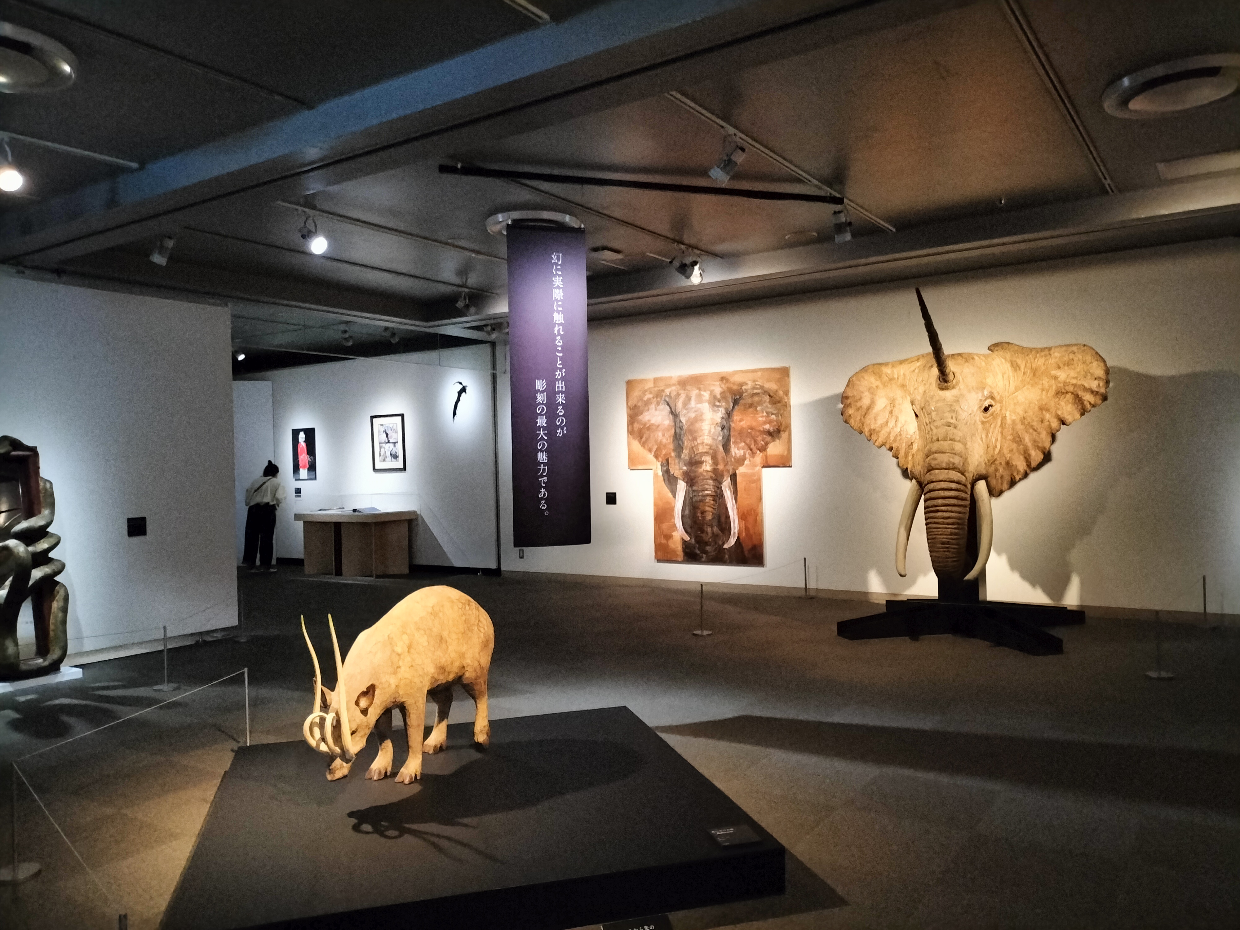 実在しない角のある象の 頭を等身大で表現。 近くで見ると丁寧に彫り込まれていることがわかります。隣にはドロー イングも展示されています。