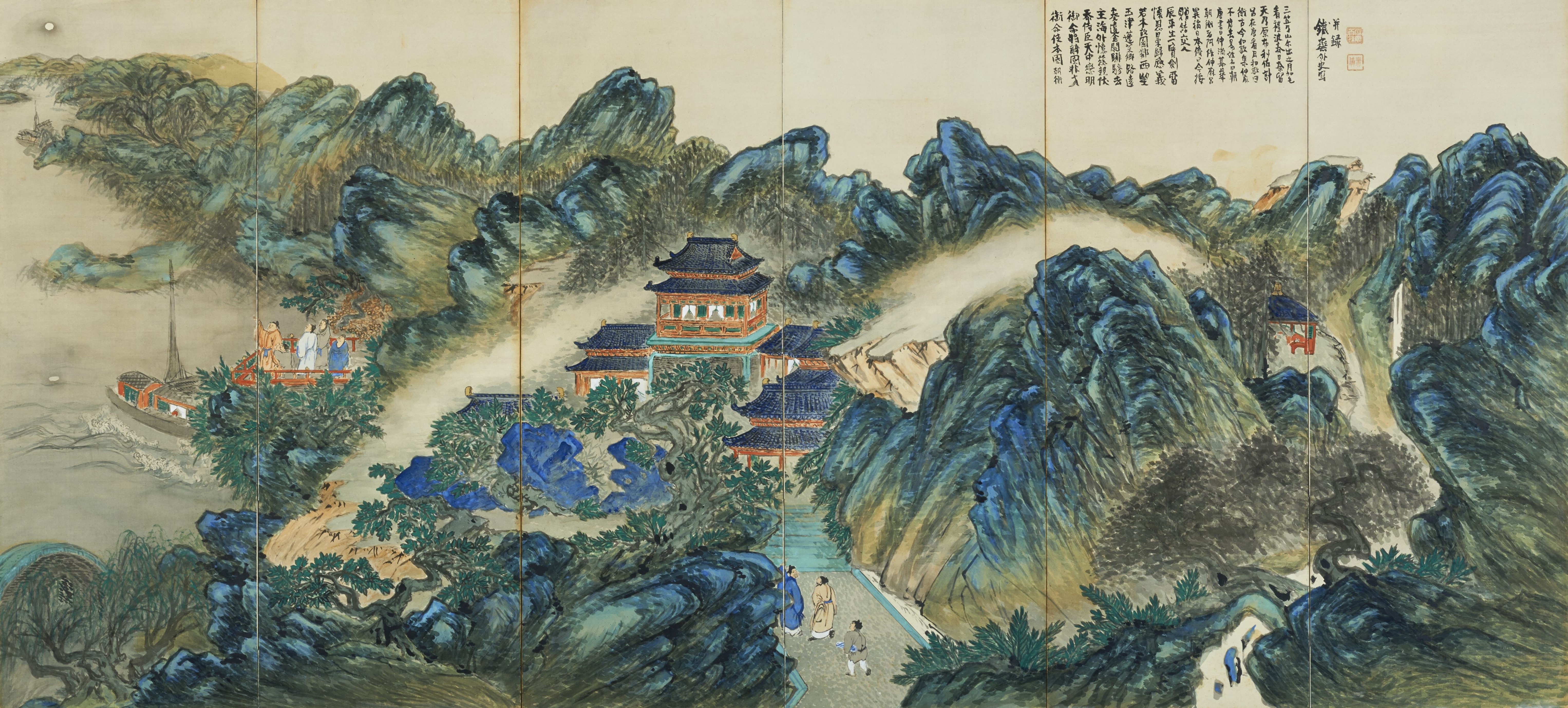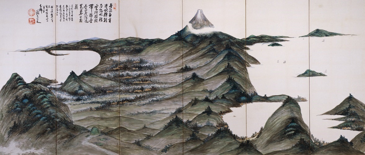 六曲屏風一双の大作《富士山図》、《妙義山図・瀞八丁図》、《富士遠望図・寒霞渓図》、《阿倍仲麻呂明州望月図・円通大師呉門隠栖図》(重要文化財)や、掛軸の《三津浜漁市図》、《菟道製茶図・粟田陶窯図》双福、《嫦娥奔月図》、《碧桃寿鳥図》、《瀛洲仙境図・西王母図・福禄寿図》三幅対など、鉄斎の画業を語るうえで欠かすことのできない作品が多数展示されます。