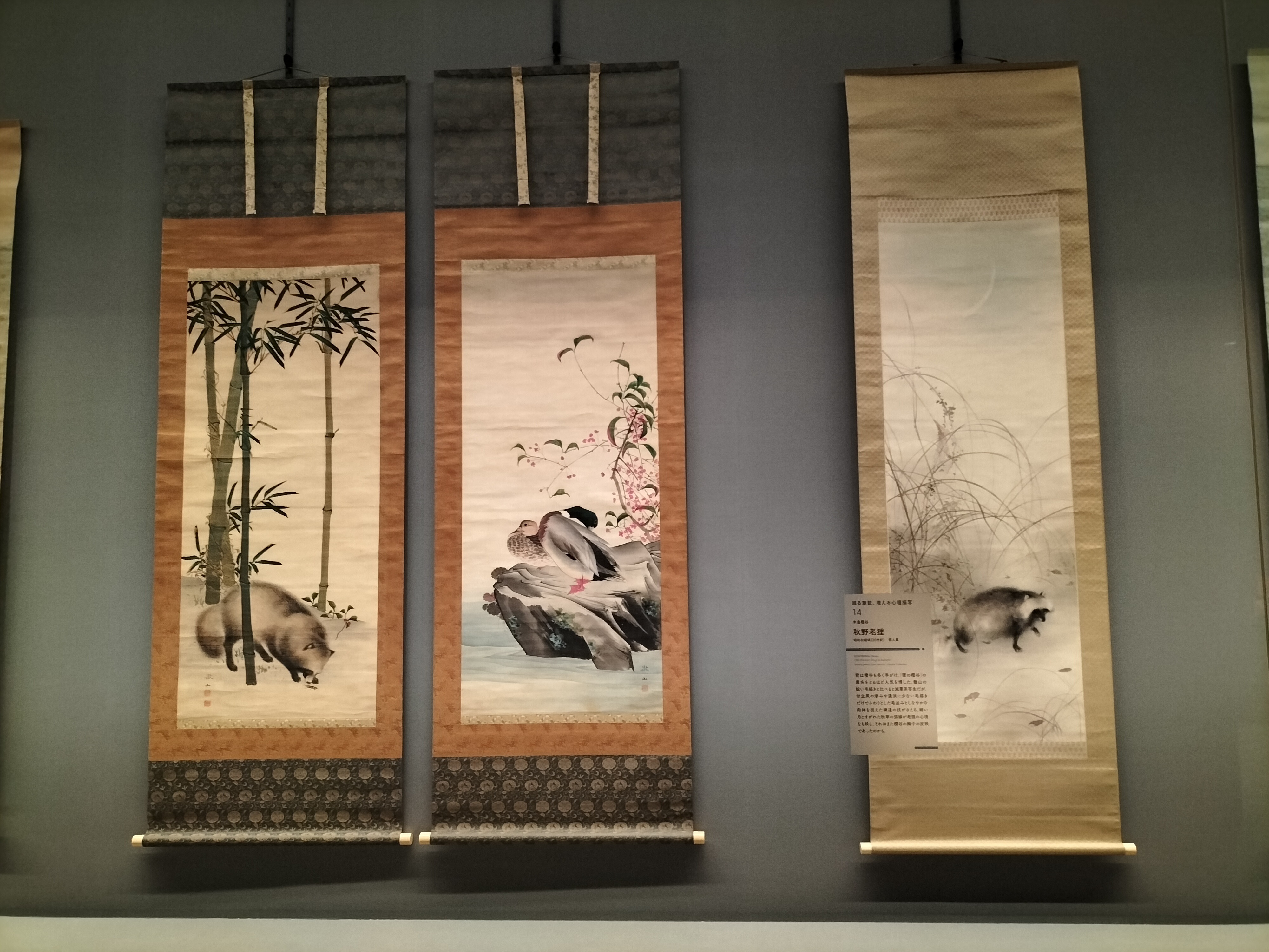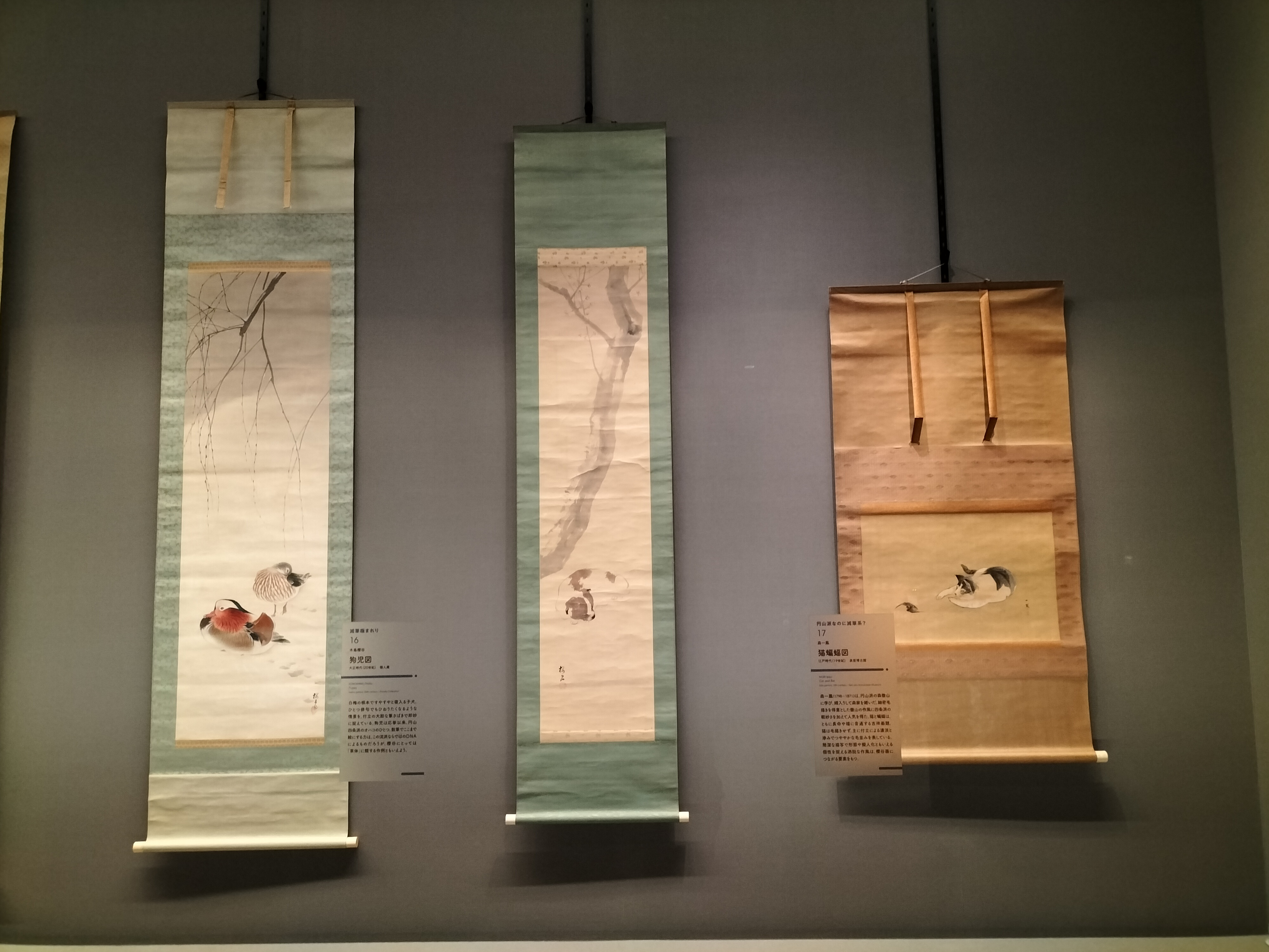 左から、木島櫻谷《雪中鴛鴦図》昭和初期頃(20世紀) 個人蔵、木島櫻谷《狗児図》大正時代(20世紀) 個人蔵、森一鳳《猫蝙蝠図》江戸時代(19世紀) 泉屋博古館