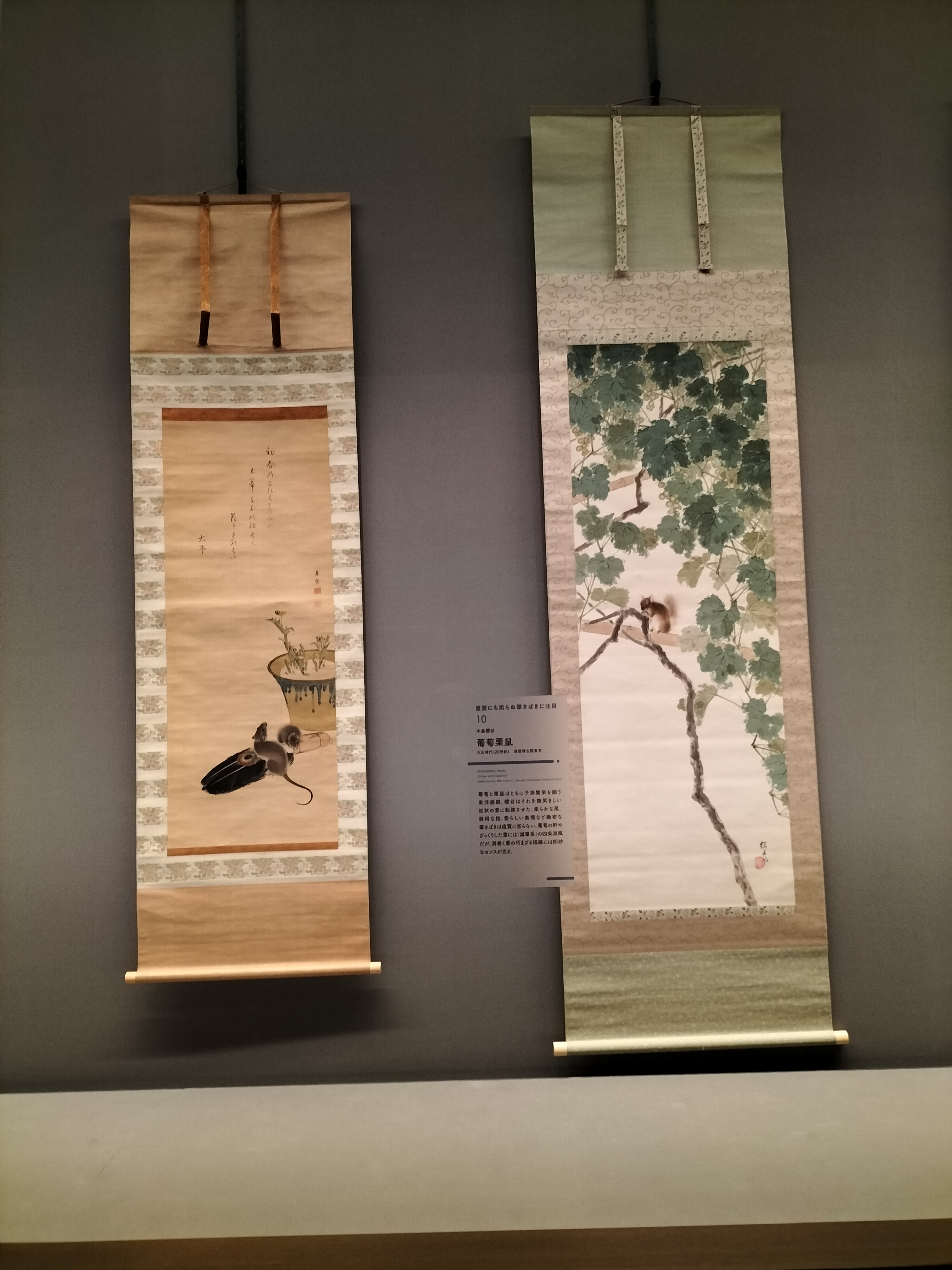 白井直賢画・本居大平賛《福寿草鼠図》江戸時代(18-19世紀) 泉屋博古館、木島櫻谷《葡萄栗鼠》大正時代(20世紀) 泉屋博古館東京