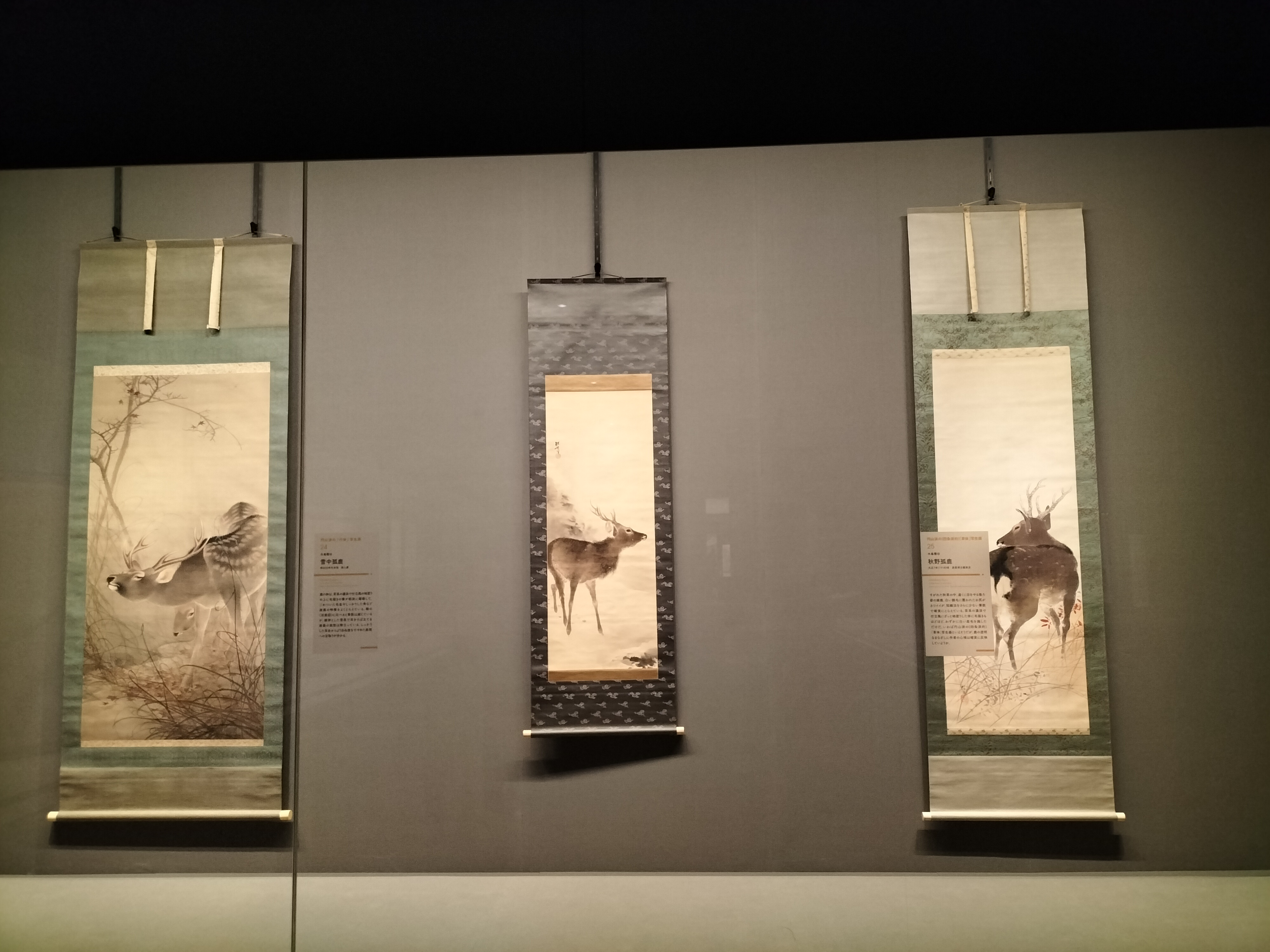 左から、木島櫻谷《双鹿図》明治30年代(19-20世紀) 個人蔵、木島櫻谷《雪中孤鹿》明治30年代末頃(20世紀) 個人蔵、木島櫻谷《秋野孤鹿》大正7年(1918)頃 泉屋博古館東京