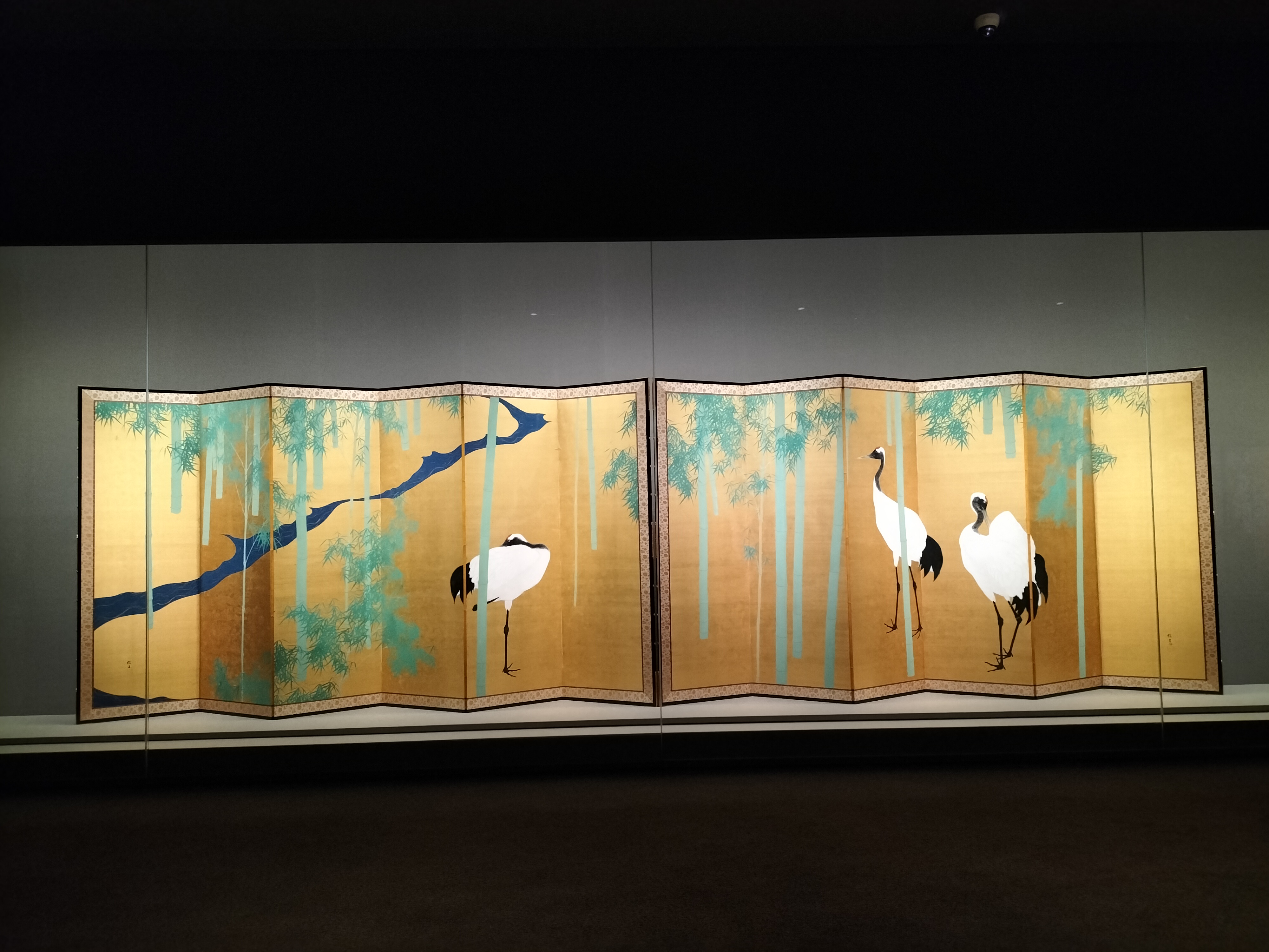 鶴好きであった15代住友吉左衞門 (春翠)のために描かれ、住友家本邸の大広間を飾った《竹林白鶴図》も展示。竹と鶴は、清雅なものとして文人たちが愛したモチーフ。緑の竹と濃紺の流水、鶴の白の対比が美しい、装飾的な屏風です。