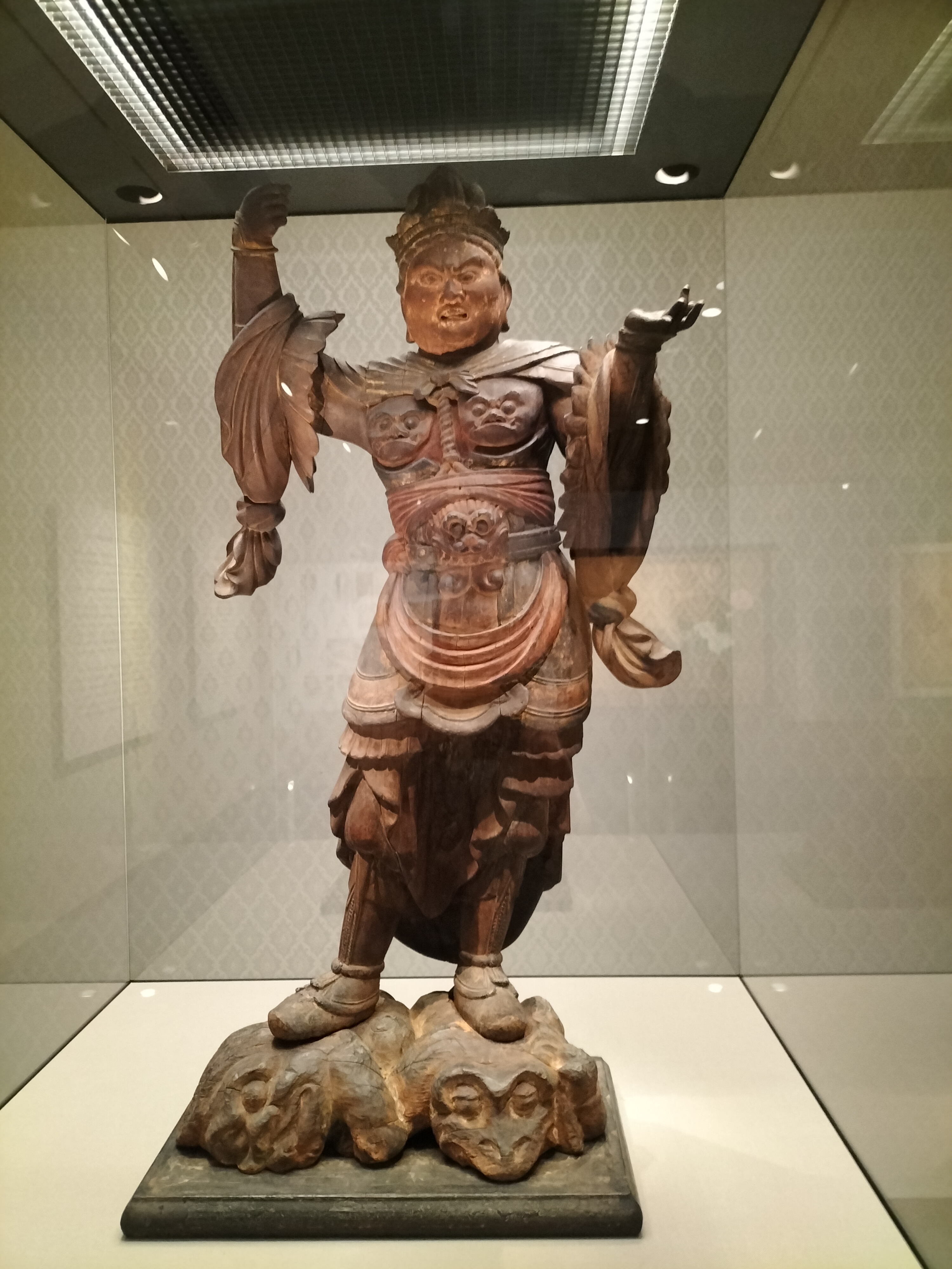 頭体幹部を一木から作り出した、院政期の有力仏師の作と考えられる平安時代後期の毘沙門天像。 胸甲を飾る2つの大きな鬼面が目を引きます。