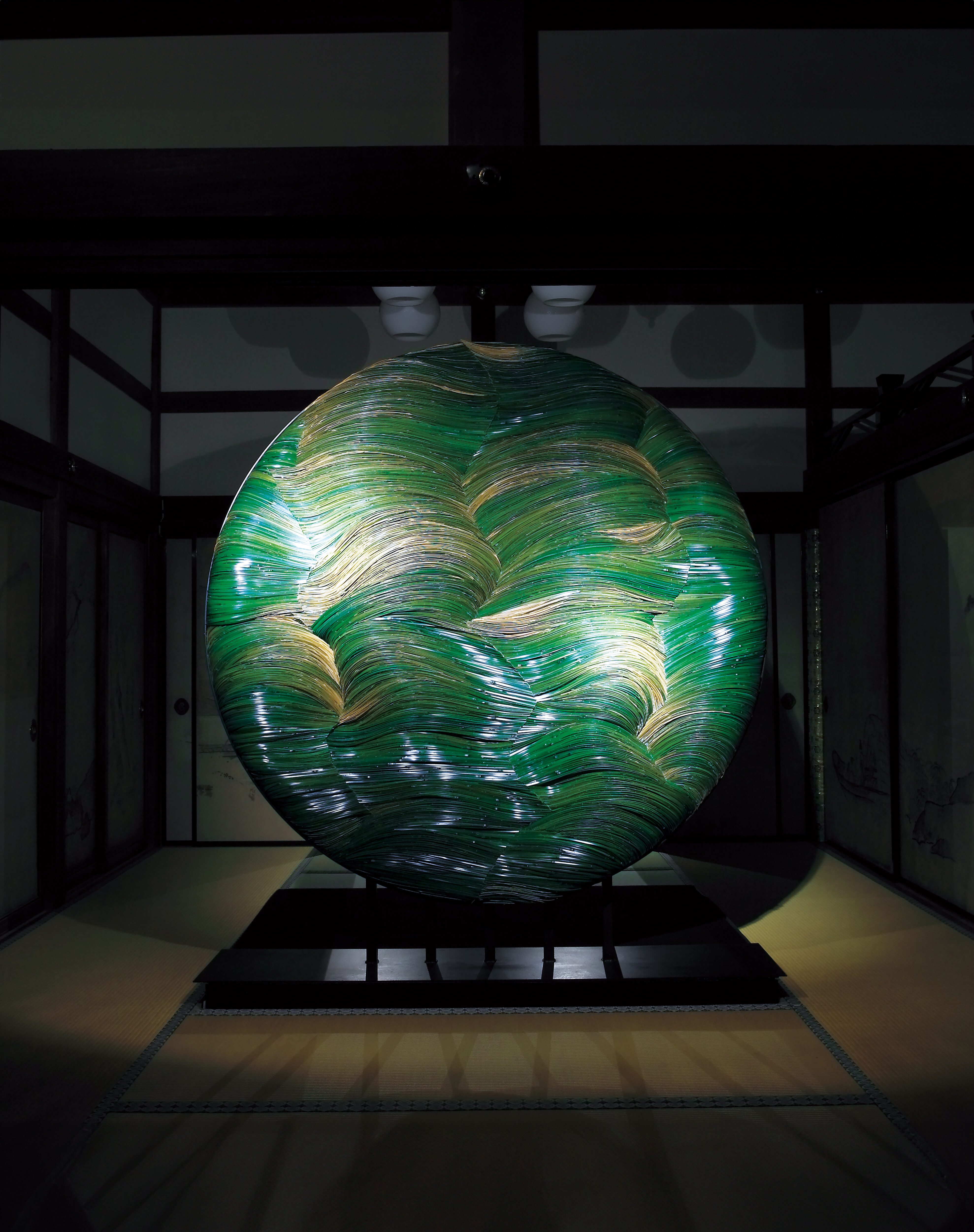 そして北山杉が連なる北庭のあちこちにも作品が展示され、夜にはライトアップされた闇に沈む庭に幻想的な光景が浮かび上がります。