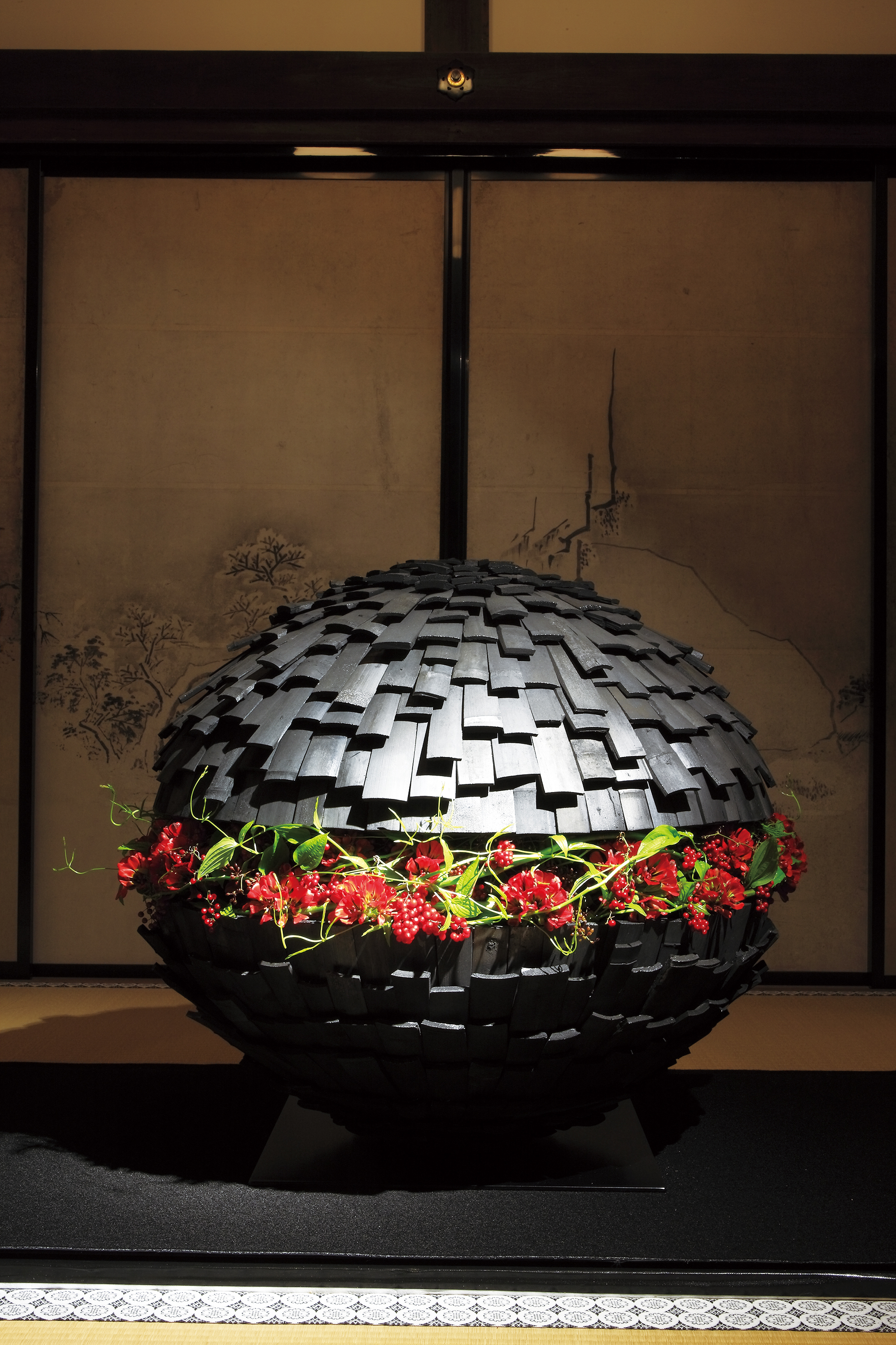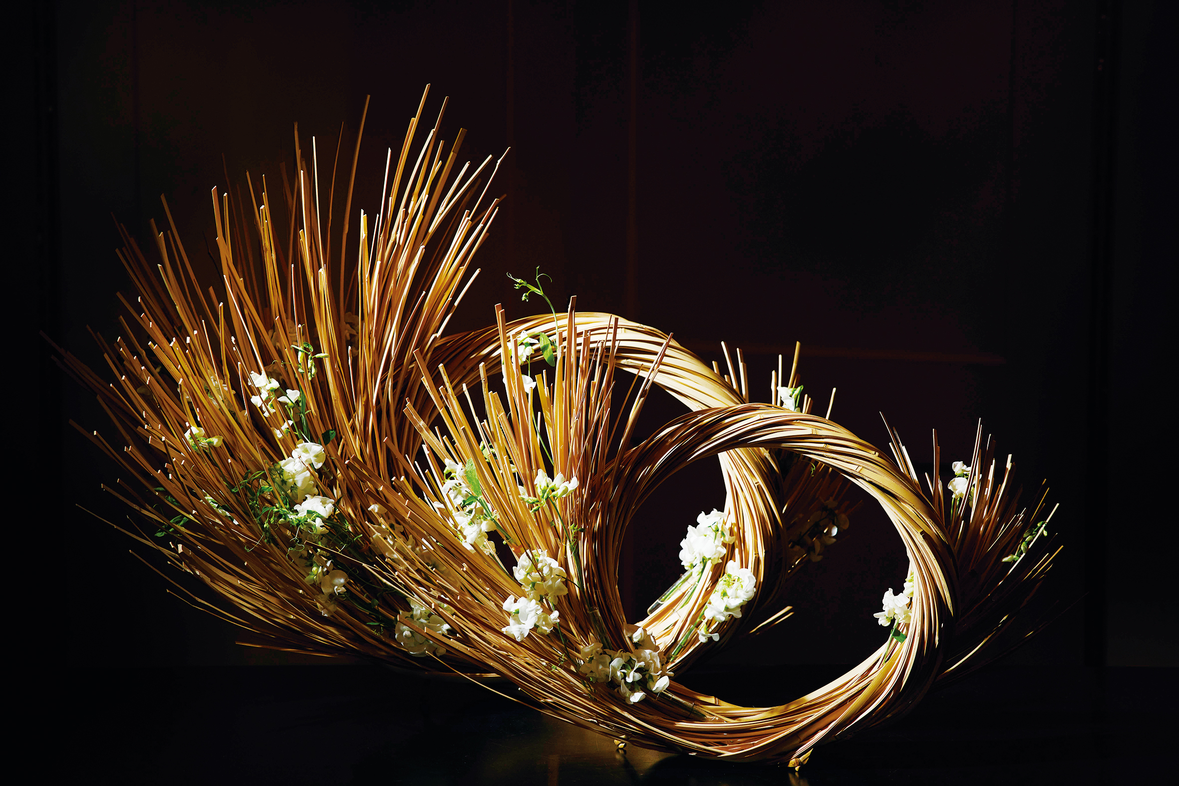 さらに、ダニエル・オストのデザインをもとに、2023年人間国宝に認定された竹作家の藤塚松星(ふじつか・しょうせい、1949-)が作りあげる竹籠や京都の職人が編む竹のオブジェのほか、伝統の輪島塗の漆器や陶器に調和するモダンでアートな花のインスタレーションが会場に広がります。