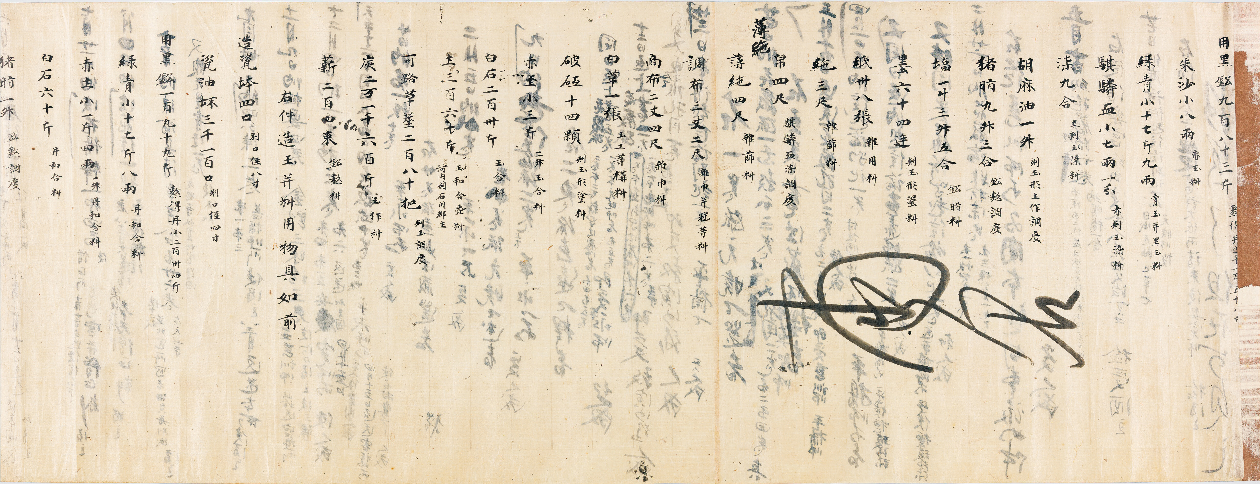 興福寺西金堂は、光明皇后が母の県犬養橘三千代の冥福を祈って建立した仏堂。本品は、これはその造営を担当した役所が天平6年(734) にまとめた製作物に関する事業報告書で、正倉院宝物の製作技法の手がかりにもなる重要史料。