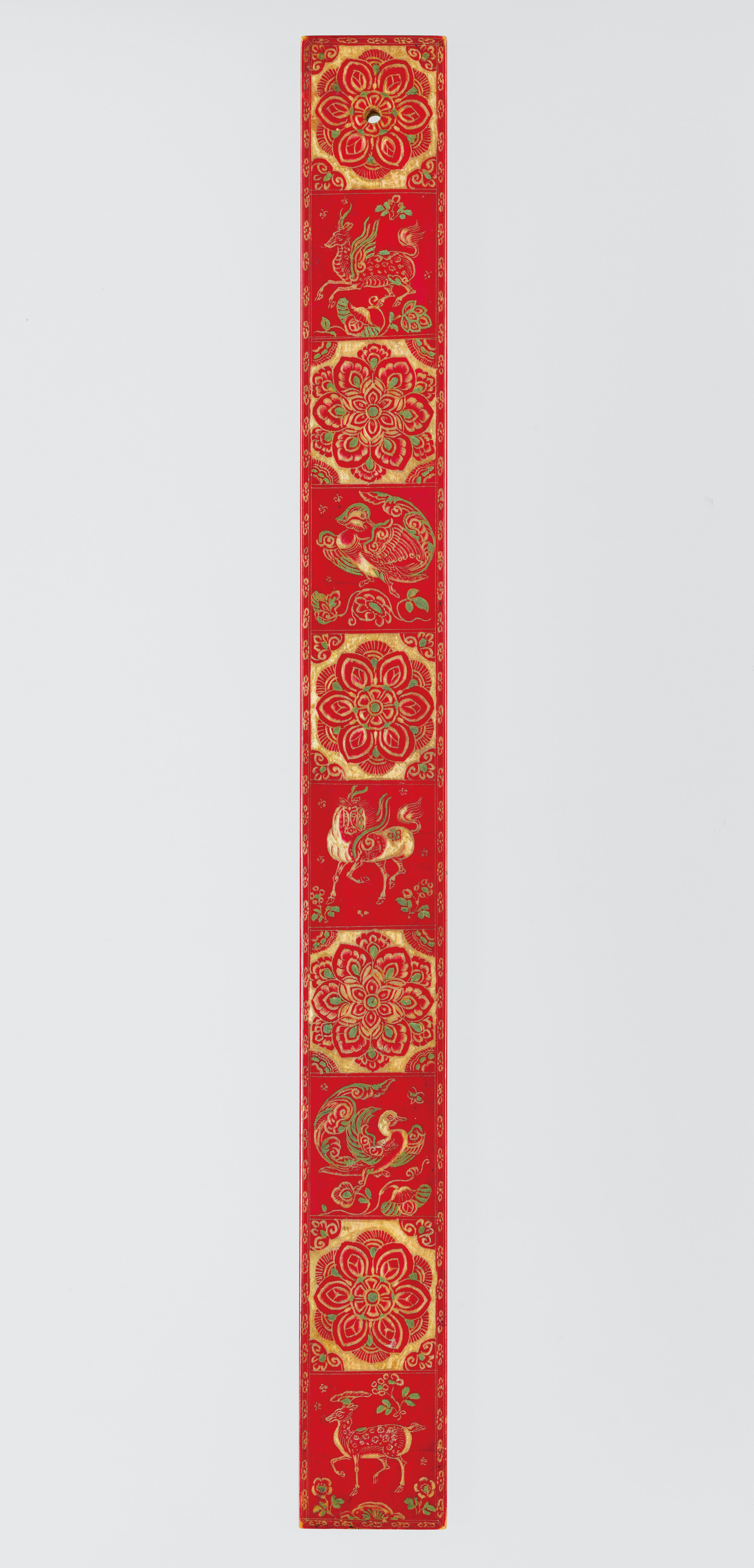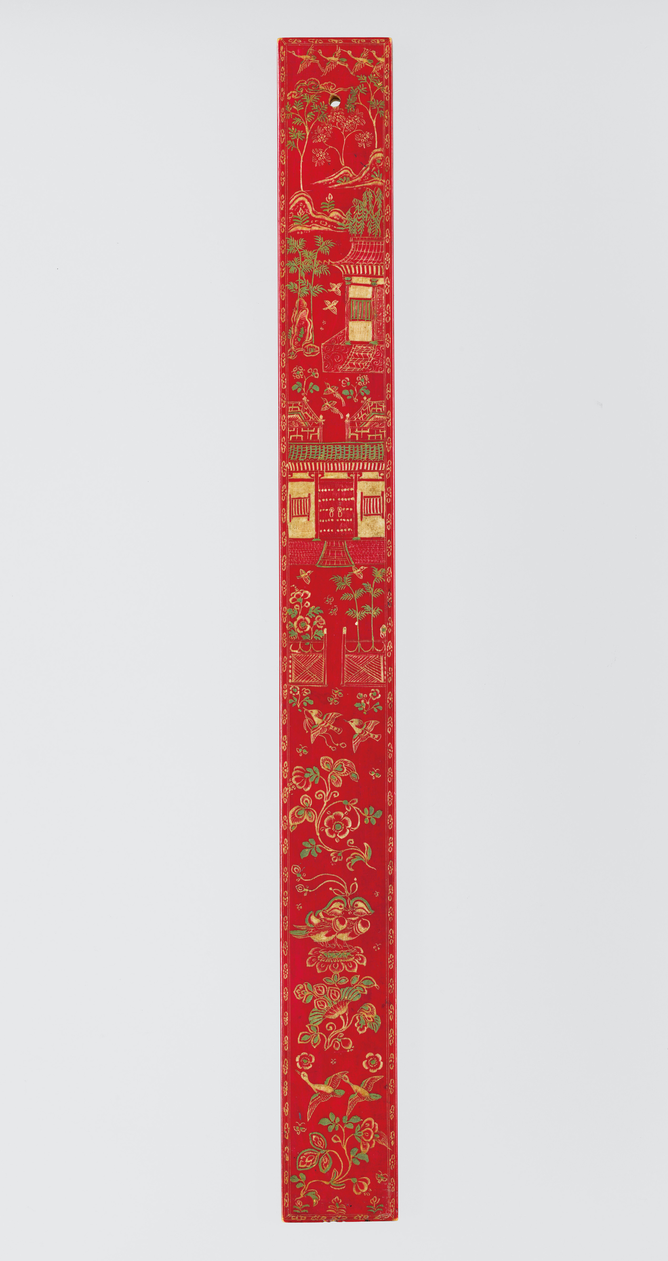 宮廷の儀礼に用いられたと考えられている装飾性の高い象牙製のものさし。表面と裏面半分に瑞祥的意味合いのある架空の動物や鳥と唐花文、裏面のもう半分には庭園のある堂閣を含む景観が表されている。