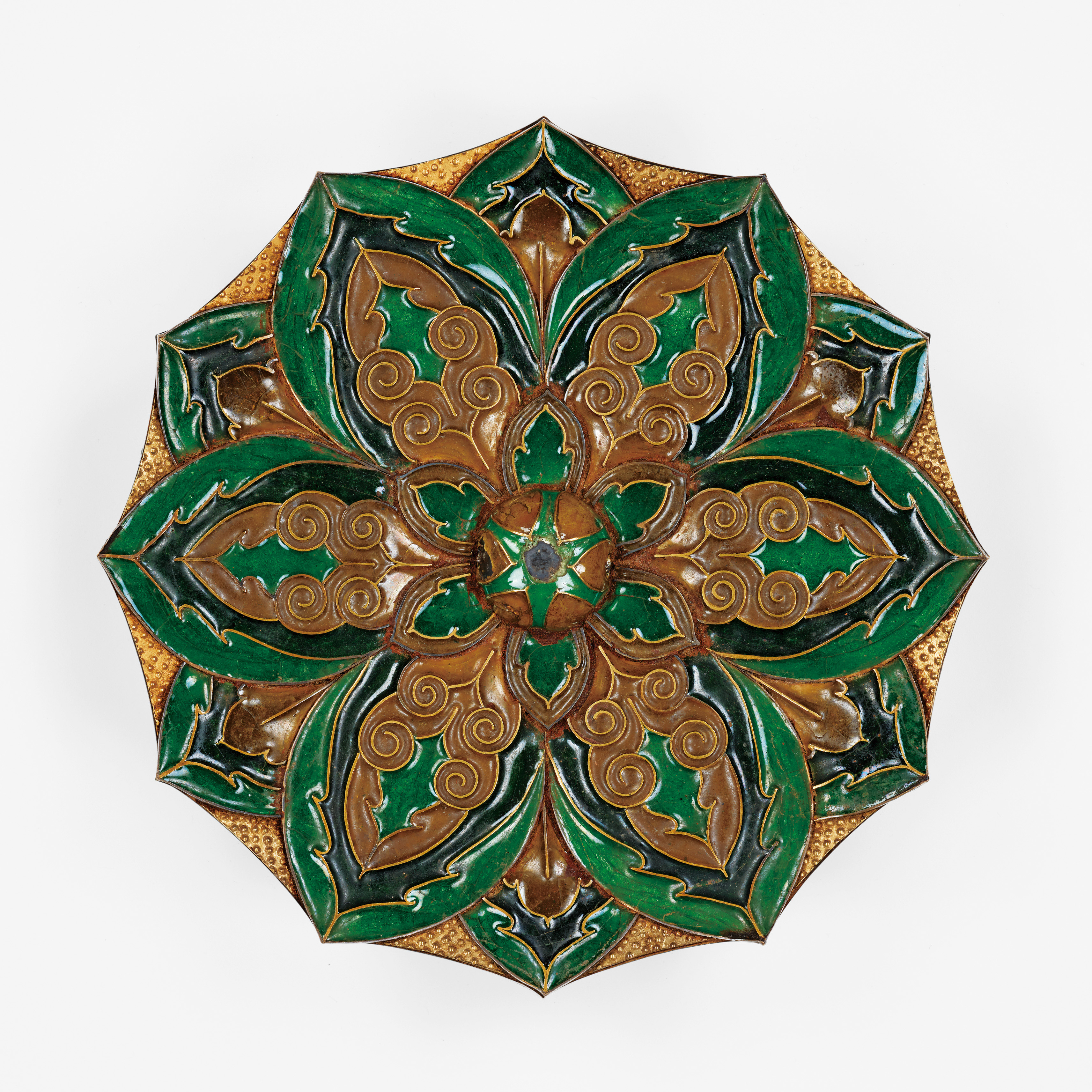 花びらは銀の薄板に、黄、緑、深緑という3色の七宝釉薬を焼き付けたもので、深い緑と金色の対比が美しい。