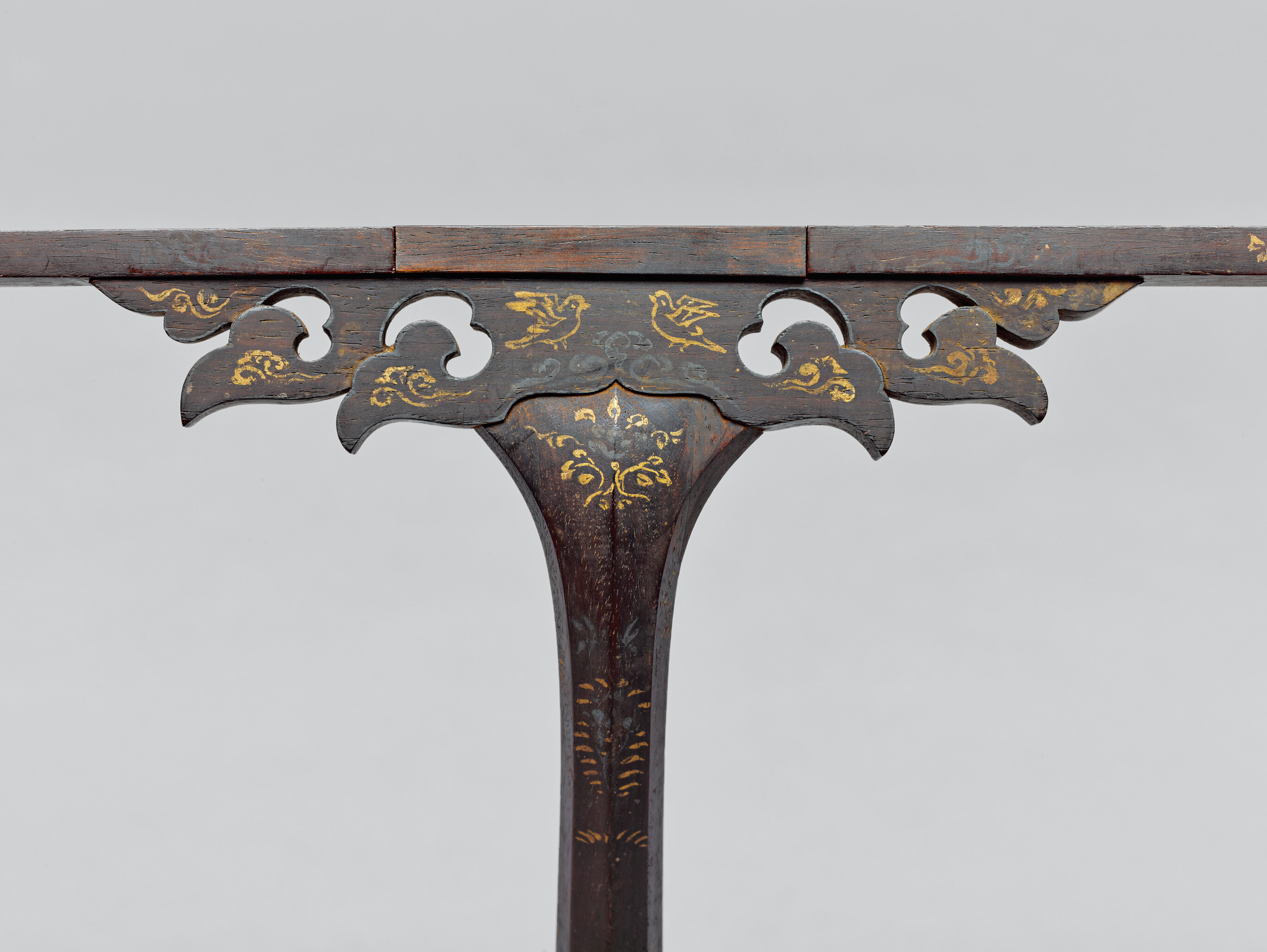 仏教儀礼に用いられた可能性が考えられる、巻物を見るための台。貴重な木材のシタン製で、表面には金銀泥で草花や飛鳥を繊細に描かれている。