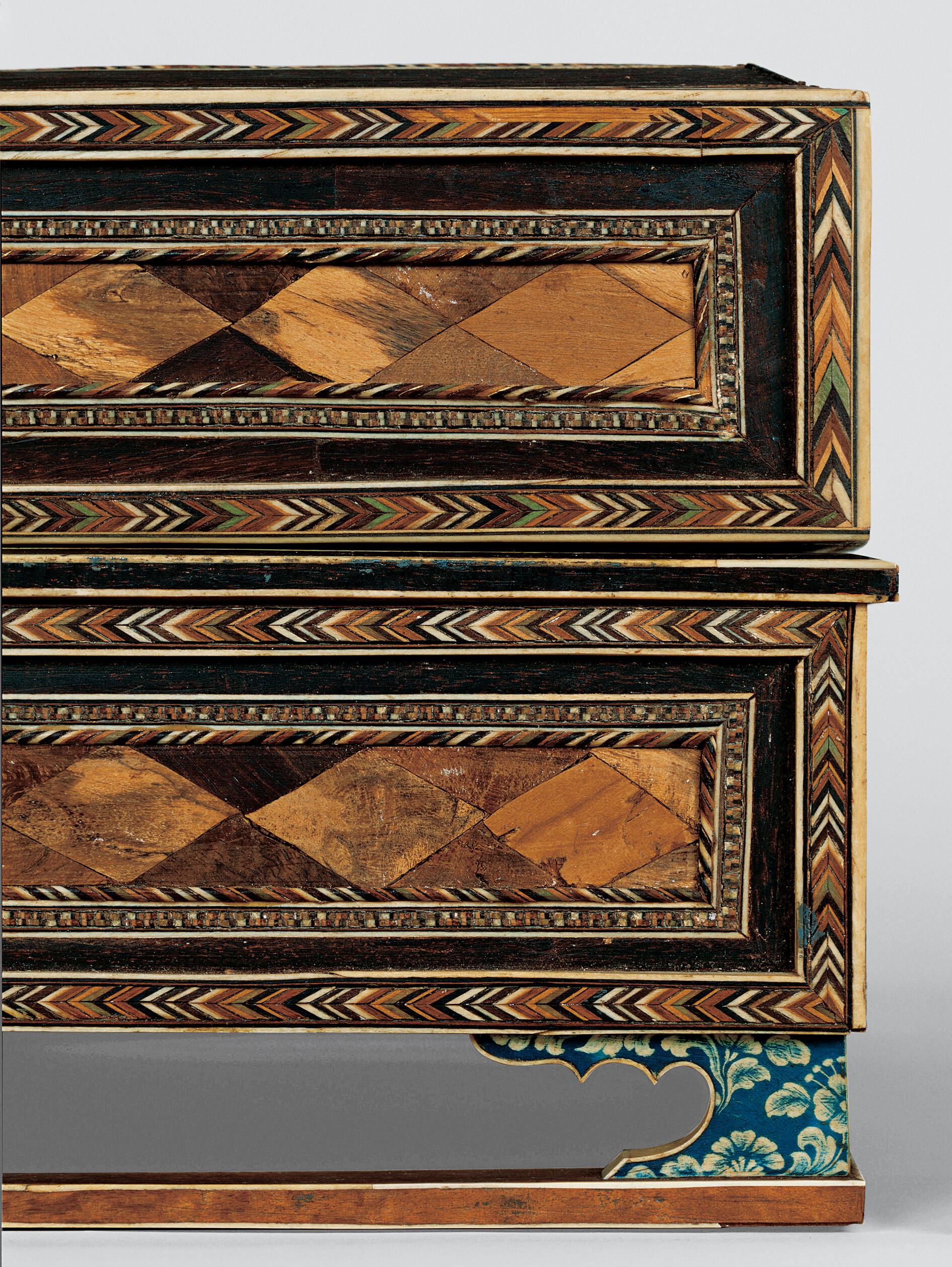 舶来の高級な素材を用いて、精巧な寄せ木細工で飾った、ほとけへの捧げものを納めたと考えられる箱