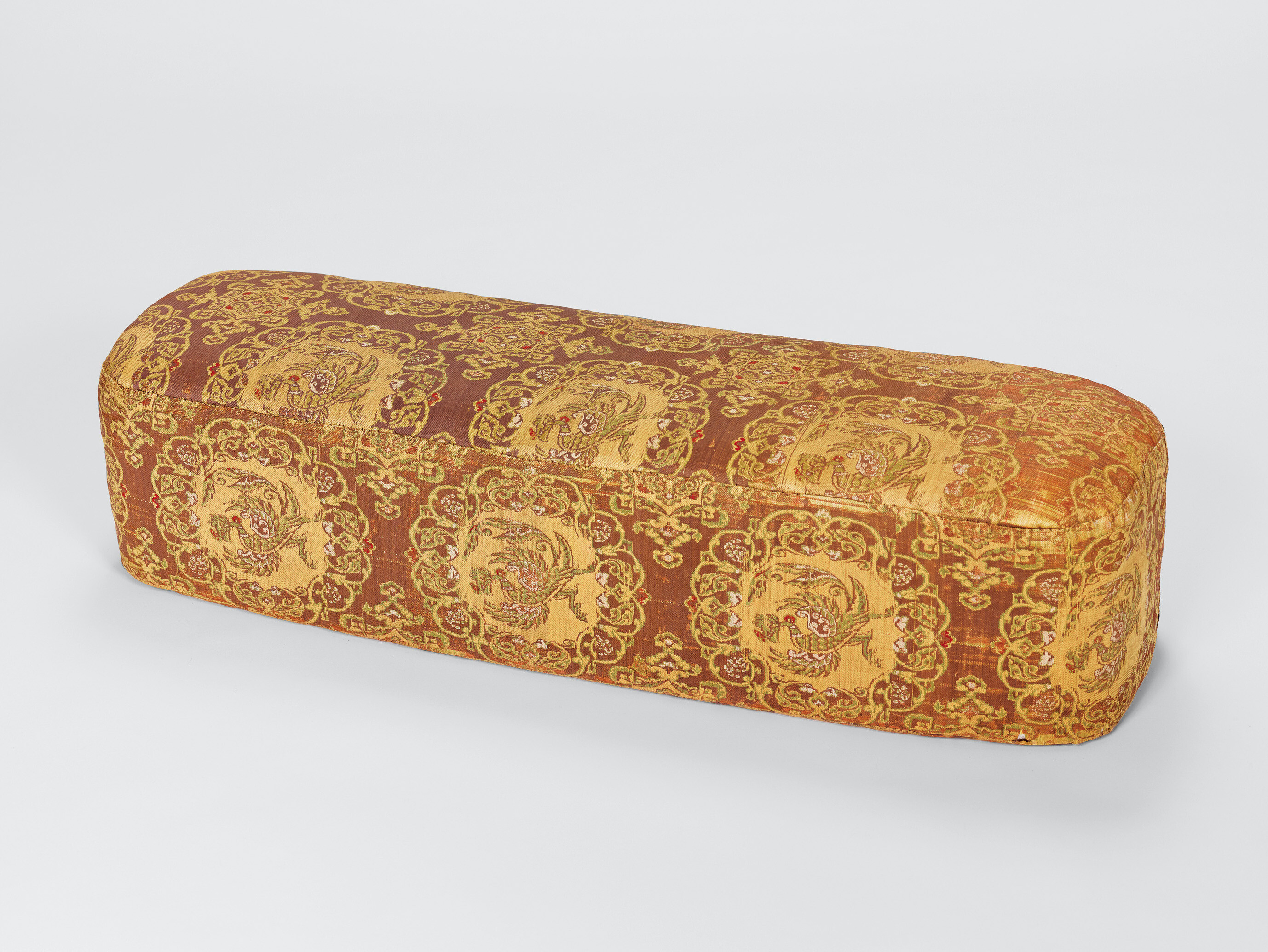 聖武天皇の美しい錦仕立ての肘おき。錦には葡萄唐草の円文で取り囲まれた鳳凰が織り表わされている。