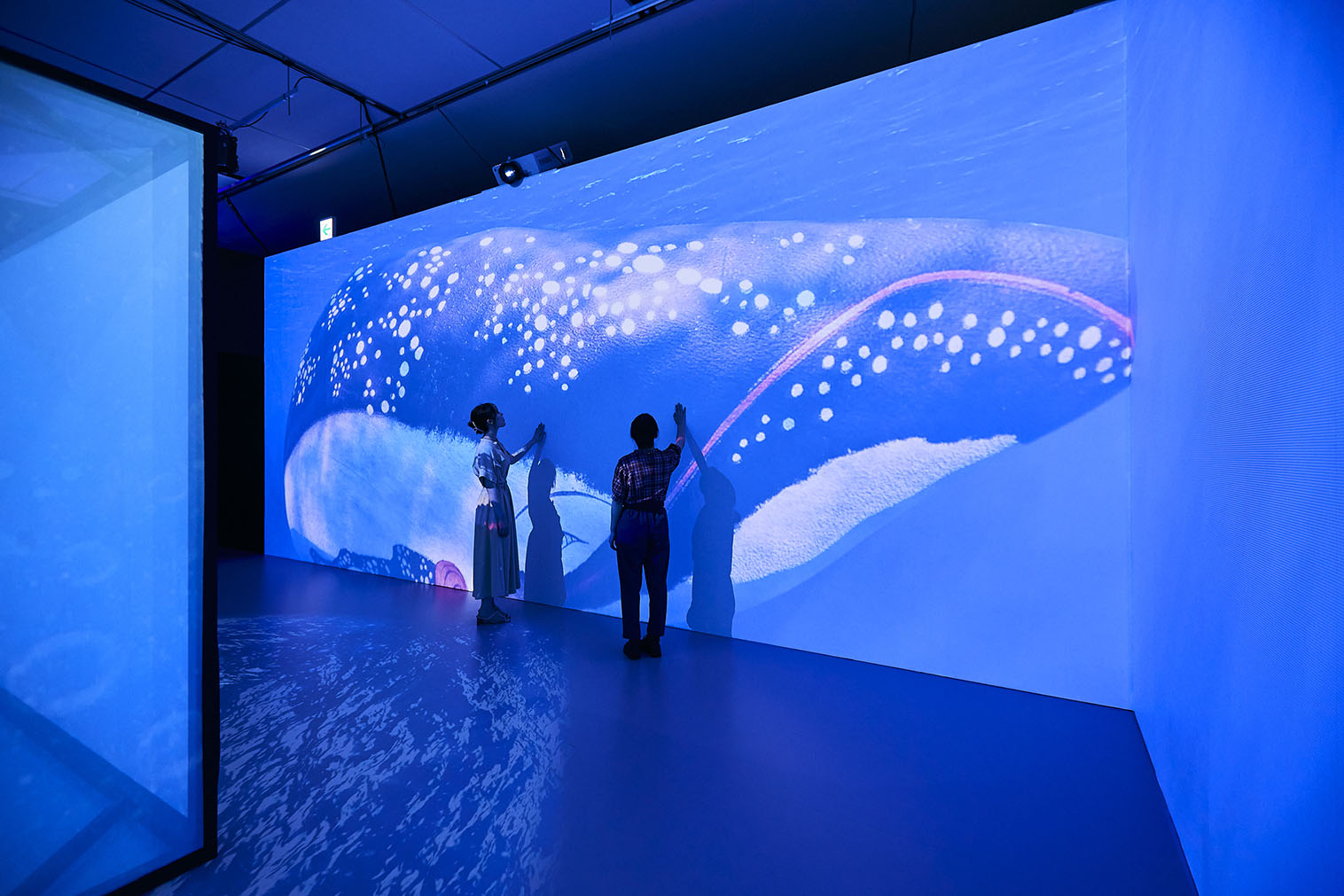 「ジャパン・ブルー」と絶賛される「藍」をテーマとする空間では、歌川国芳の「宮本武蔵の鯨退治」に描かれたクジラが立体的な3DCGとして描かれ、ダイナミックに泳ぎます。