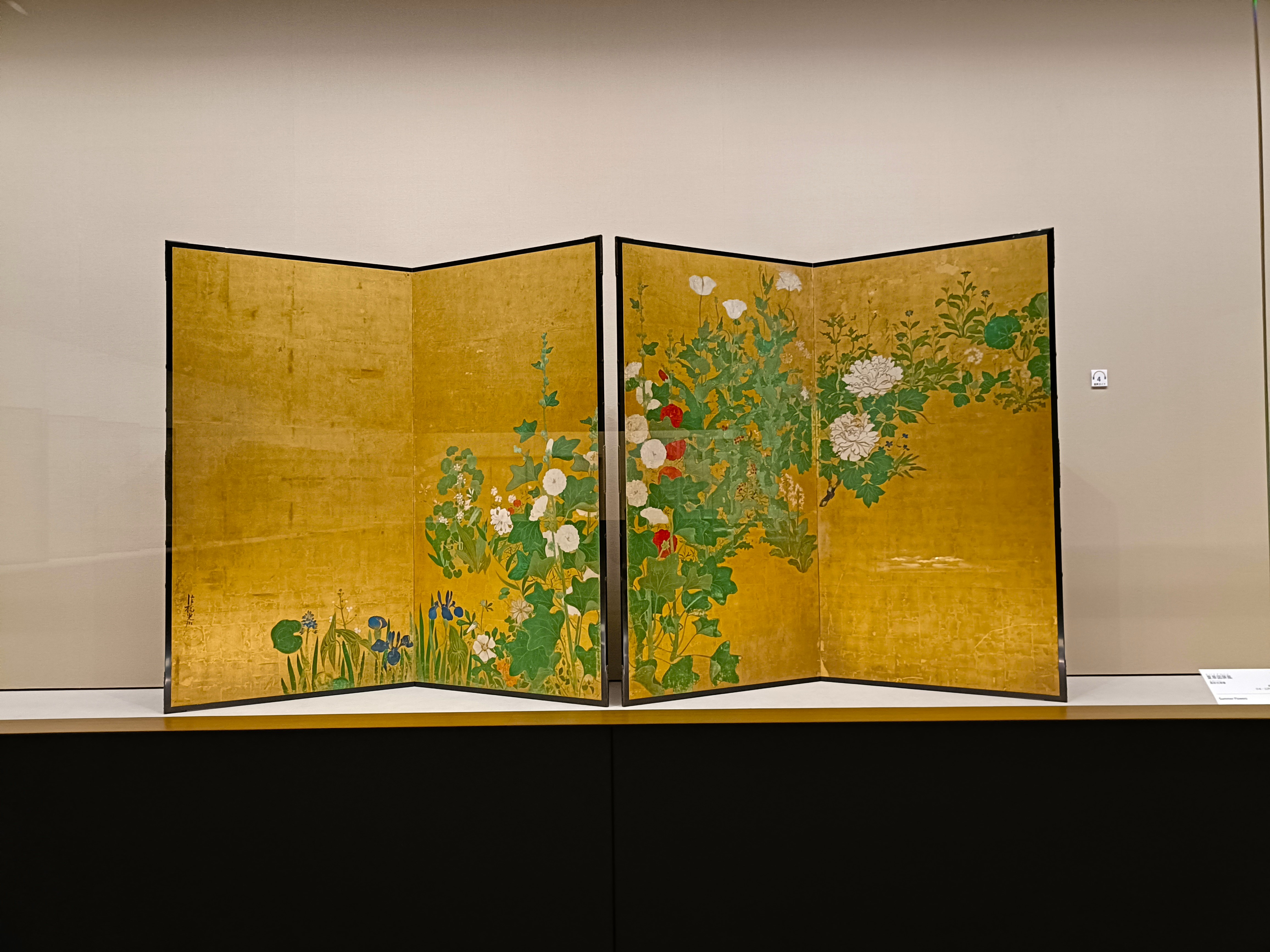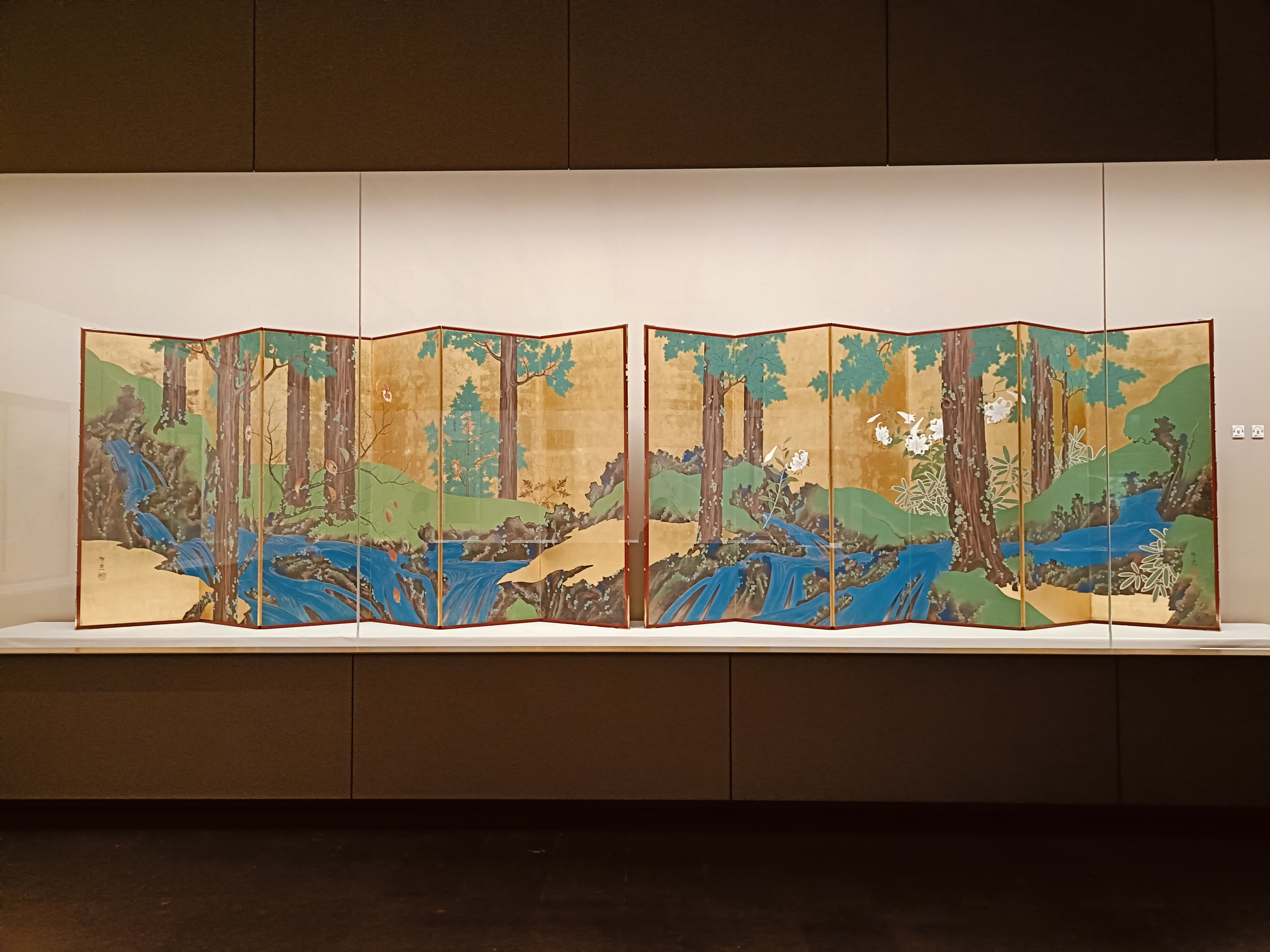 金箔を背景に、右側の屏風には、白い山百合が咲く夏の風景、左側には、秋の紅葉が表現され、渓流が流れる檜の林を背景に、季節の移り変わりが鮮やかな色彩で描かれています。