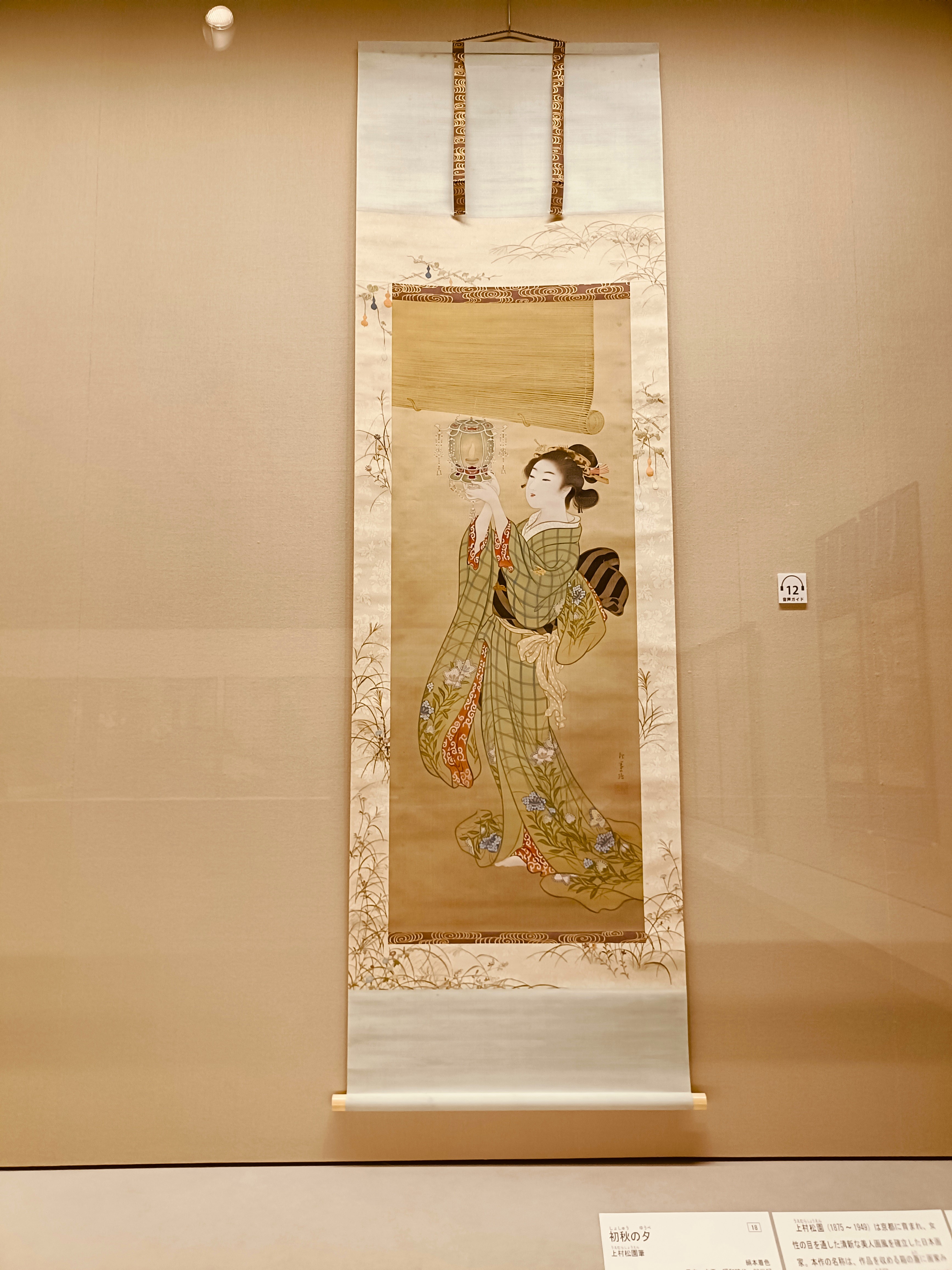 秋の美しさを表現した作品も多く展示されています。美人画を得意とした上村松園の《初秋の夕》では、桔梗柄の着物を着た女性が吊行灯を持つ姿が描かれ、秋の黄昏時の情緒が感じられます。