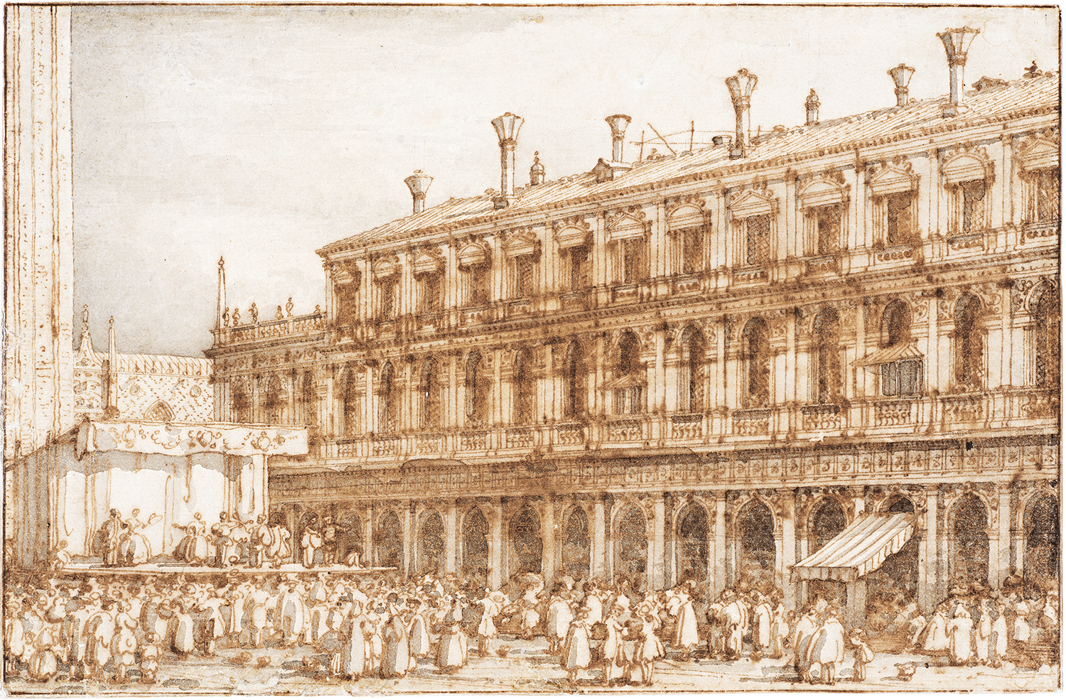 カナレット《サン・マルコ広場でのコメディア・デラルテの上演》1755–1757年? ペン、インク、淡彩/紙 20.5×31.7cm ヴィクトリア・アンド・アルバート博物館、ロンドン © Victoria and Albert Museum, London.