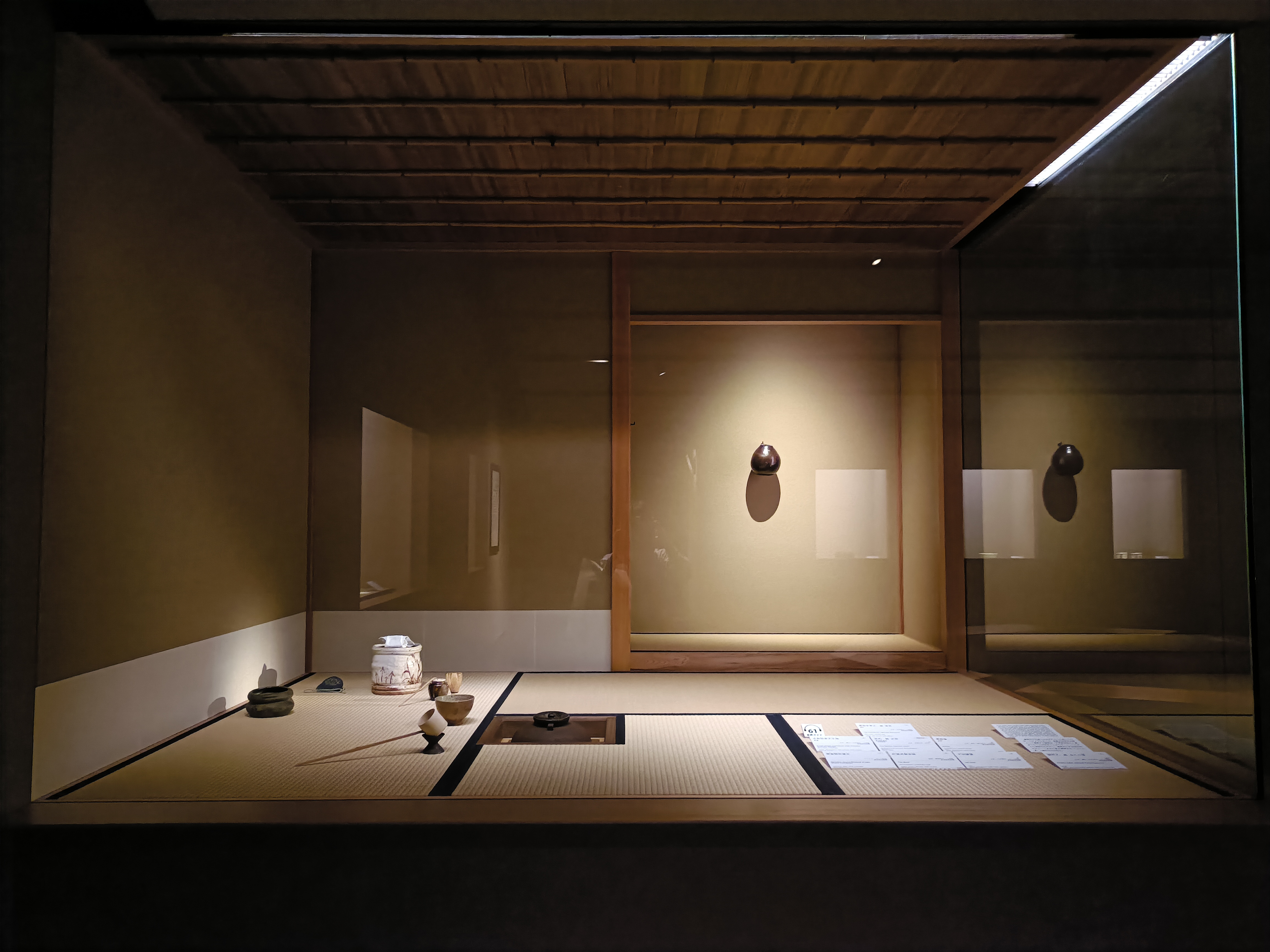 「炉開きの茶会」(展示室6)では、11月の炉開きの茶会を再現した展示が行われています。炭道具や茶碗など、格式高い茶道具が取り合わせられており、静かな空間で茶の湯の世界に浸ることができます。
