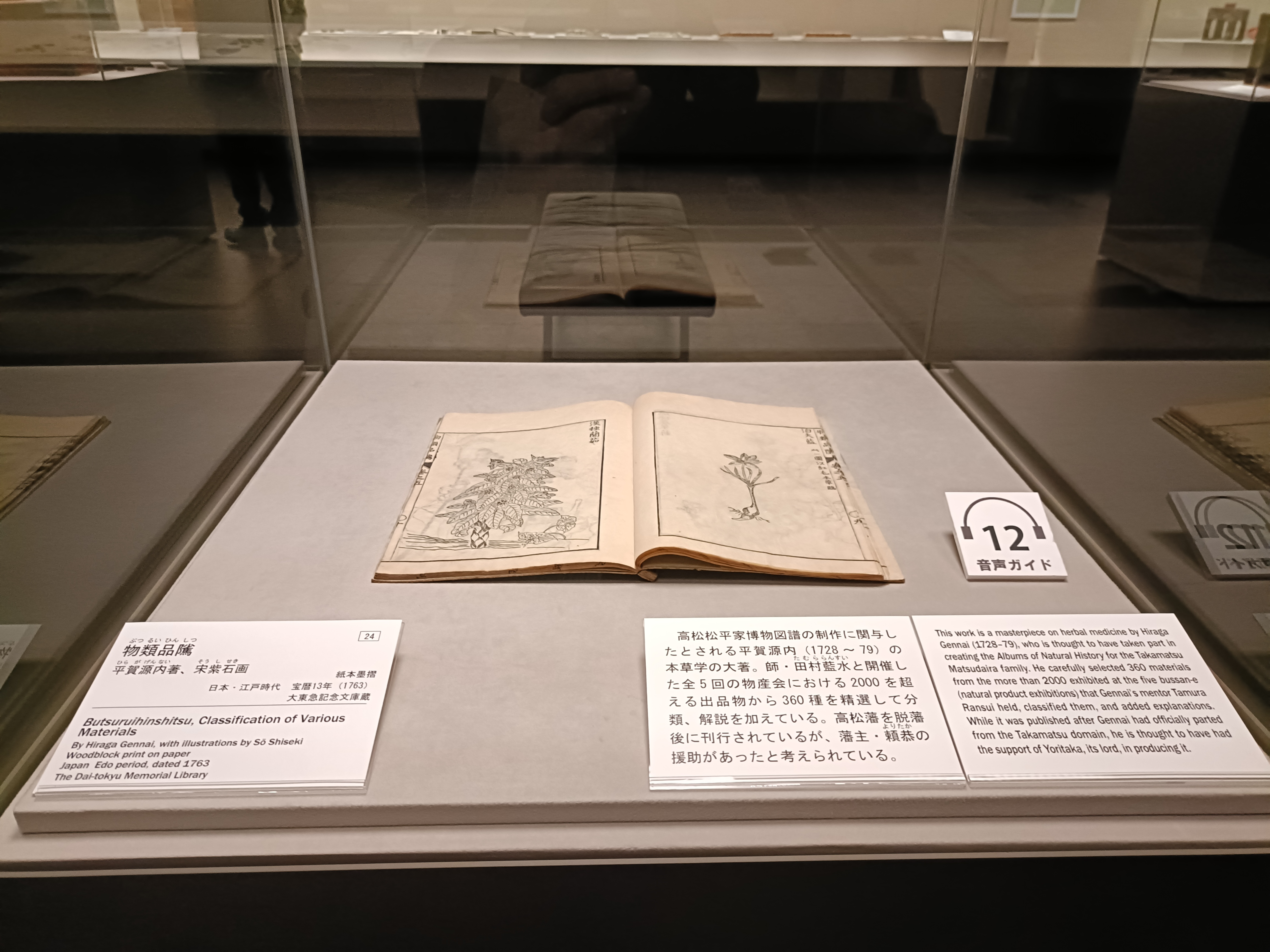 「第4章 博物図譜の広がり」では、博物学の広がりが高松藩だけにとどまらなかったことを示す資料が展示されています。熊本藩6代藩主・細川重賢の命で制作された植物図譜には、高松松平家の図譜と同じ図像も含まれており、大名家同士で図譜の貸し借りや転写が行われていたことがうかがえます。