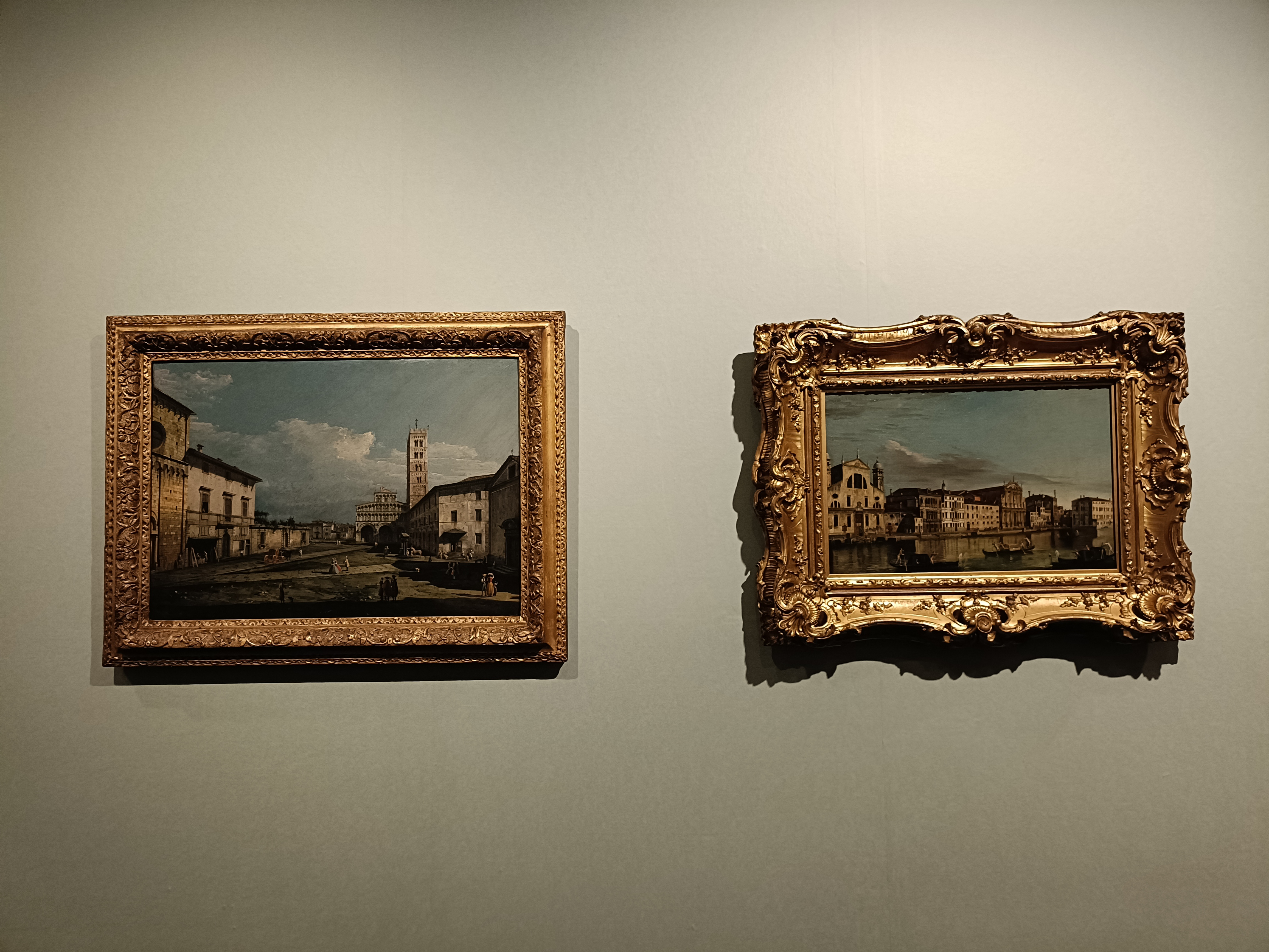 (左から)ベルナルド・ベロット《ルッカ、サン・マルティーノ広場》1742-1746年 ヨーク・ミュージアム・トラスト(ヨーク美術館)、作者不詳《カナル・グランデ:サンタ・ルチア聖堂とスカルツィ聖堂、ヴェネツィア》1740-1760年頃 スコットランド国立美術館