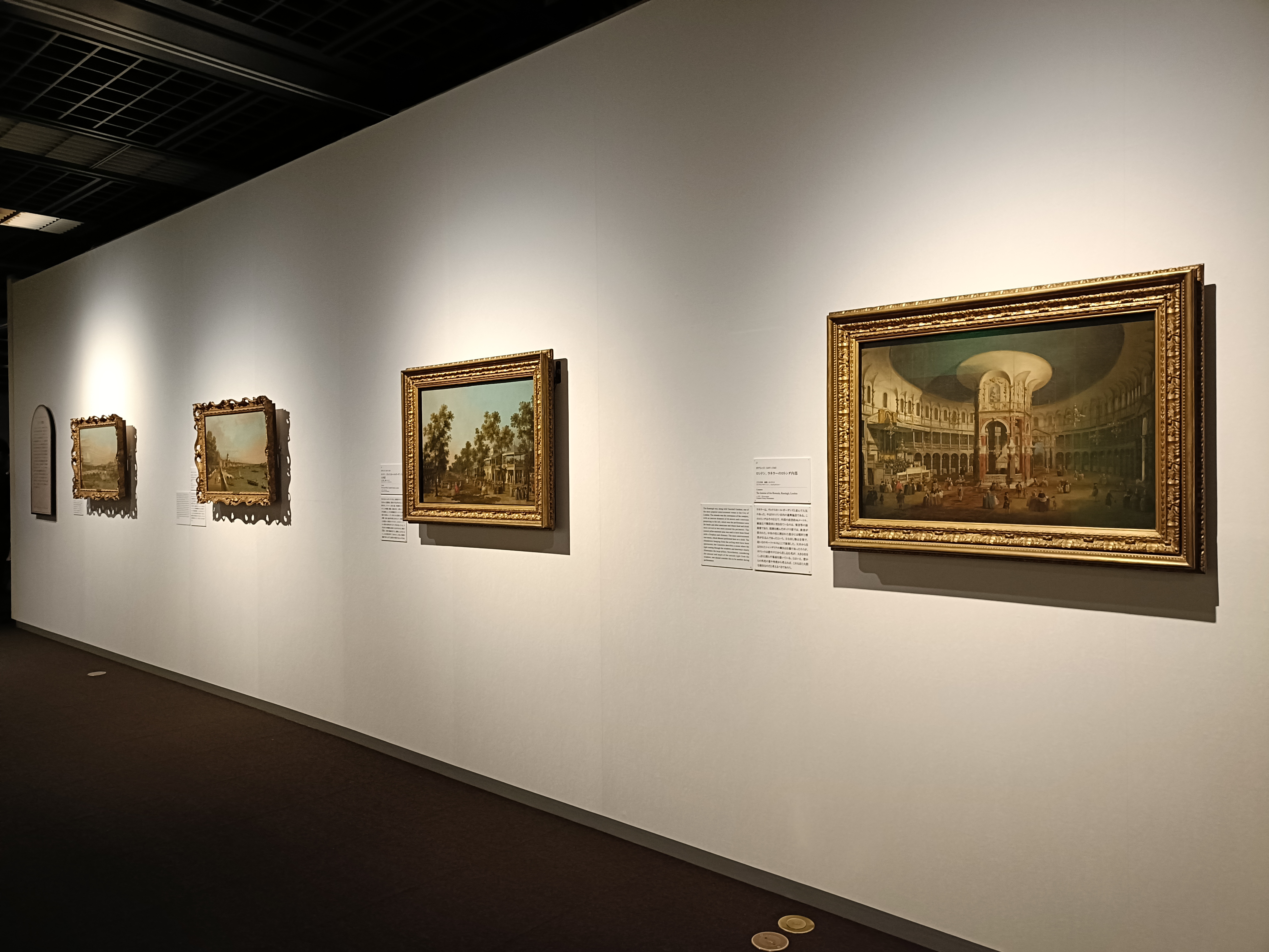 カナレットはヴェネツィア以外の都市も描いています。《ラネラーのロトンダ内部》は、モーツァルトが幼少期にコンサートを開いたロンドンの高級遊園地にある建物を描いた作品です。カナレットは、日中の光が大きな柱を鮮やかに照らすダイナミックな情景を表現しています。ローマの名所を題材にした作品も展示されています。