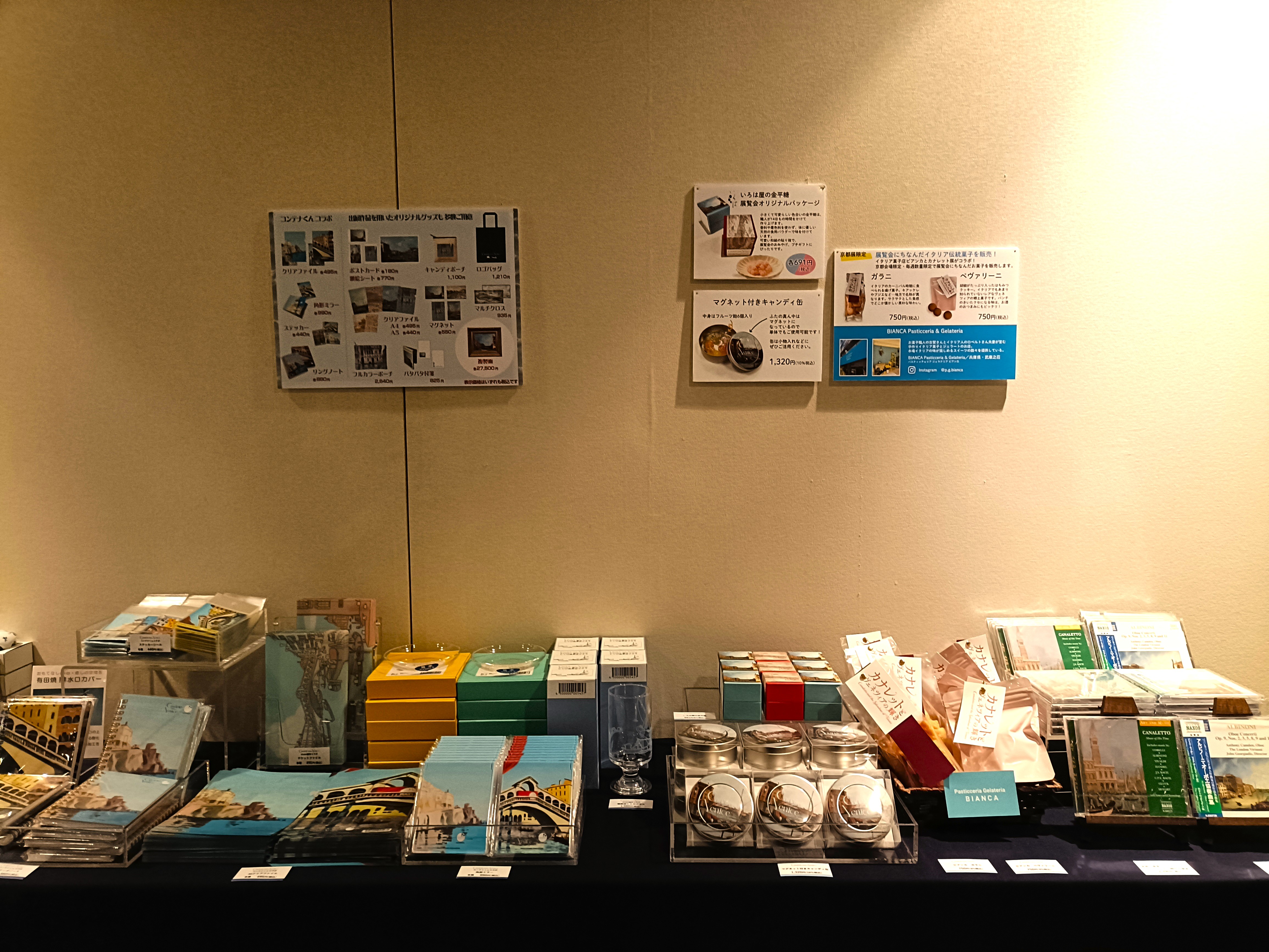ミュージアムショップでは、カナレットの作品をモチーフにしたグッズや、京都会場限定のイタリアの伝統菓子など、鑑賞の記念やおみやげにもぴったりな多彩なアイテムが用意されています。