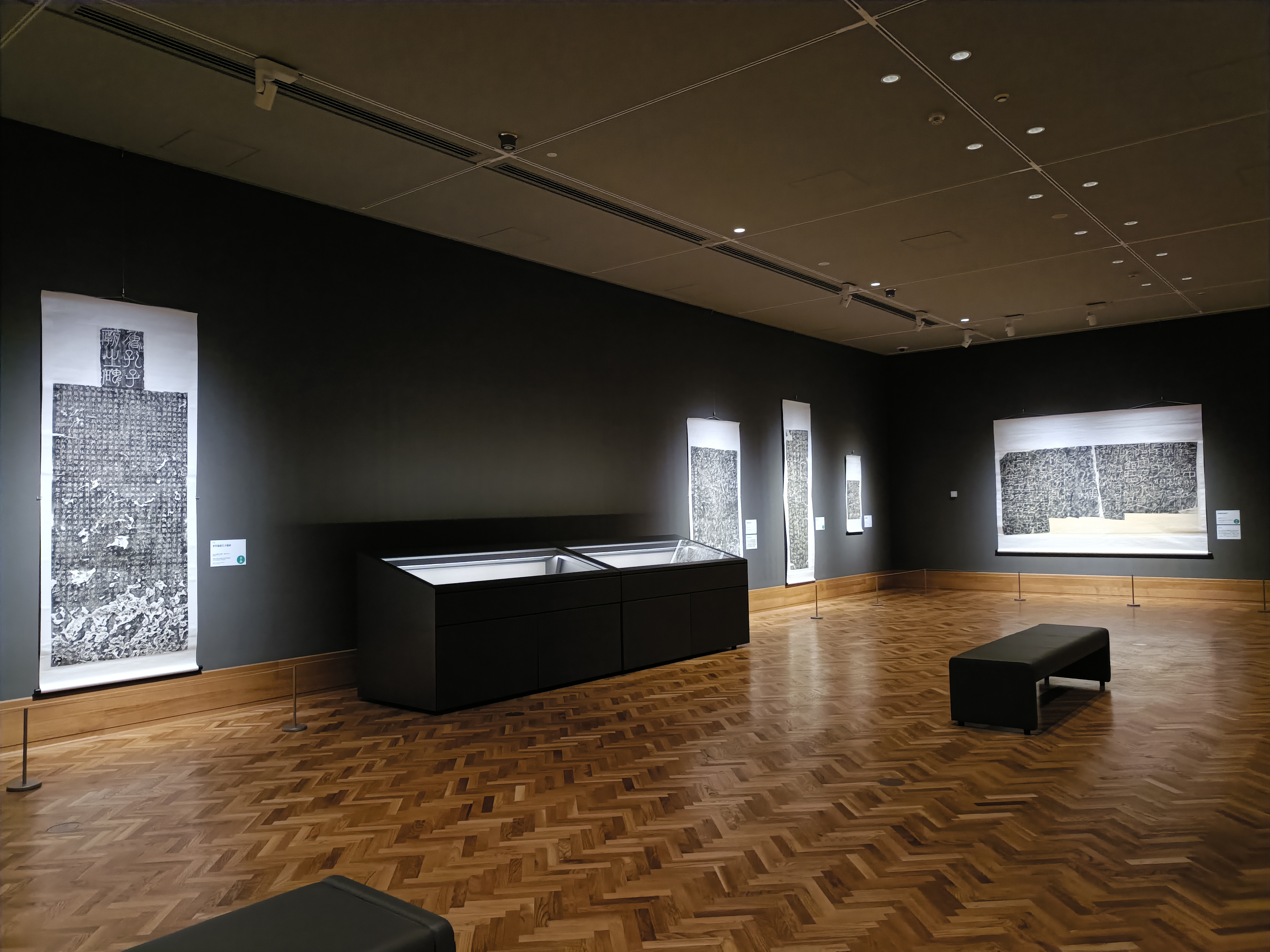 「竣工記念の石刻」では、師古斎コレクションを中心に、中国古代の石碑や石刻が展示されています。《開通褒斜道刻石》は、後漢時代に100kmにも及ぶ険しい道路の開通を記念して崖に刻まれた碑文で、当時の土木技術の高さを物語っています。