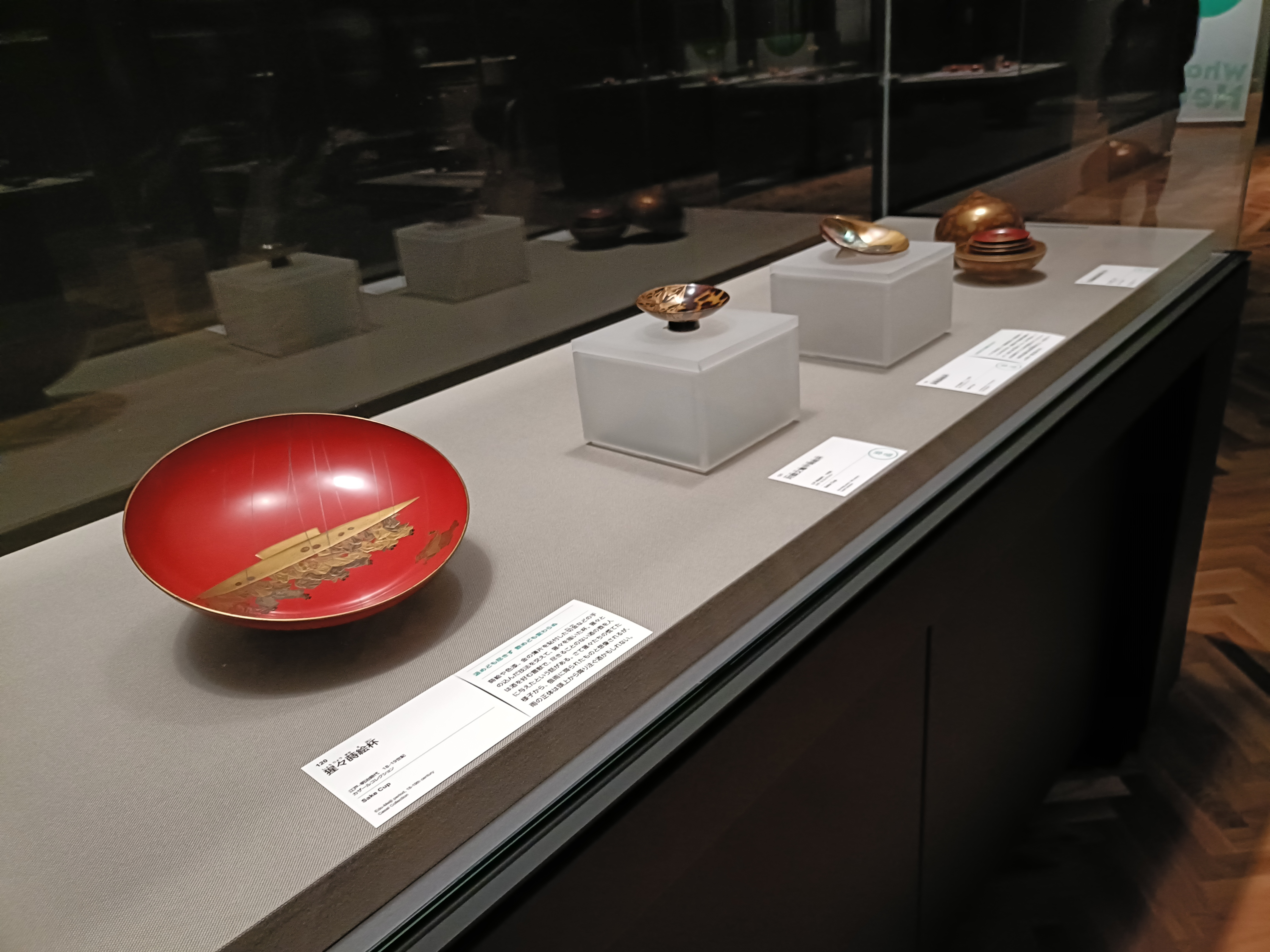 第2会場「祝杯!華やかな酒器たち」展示風景より、(左) 《猩々蒔絵杯》江戸–明治時代・18–19世紀 カザールコレクション