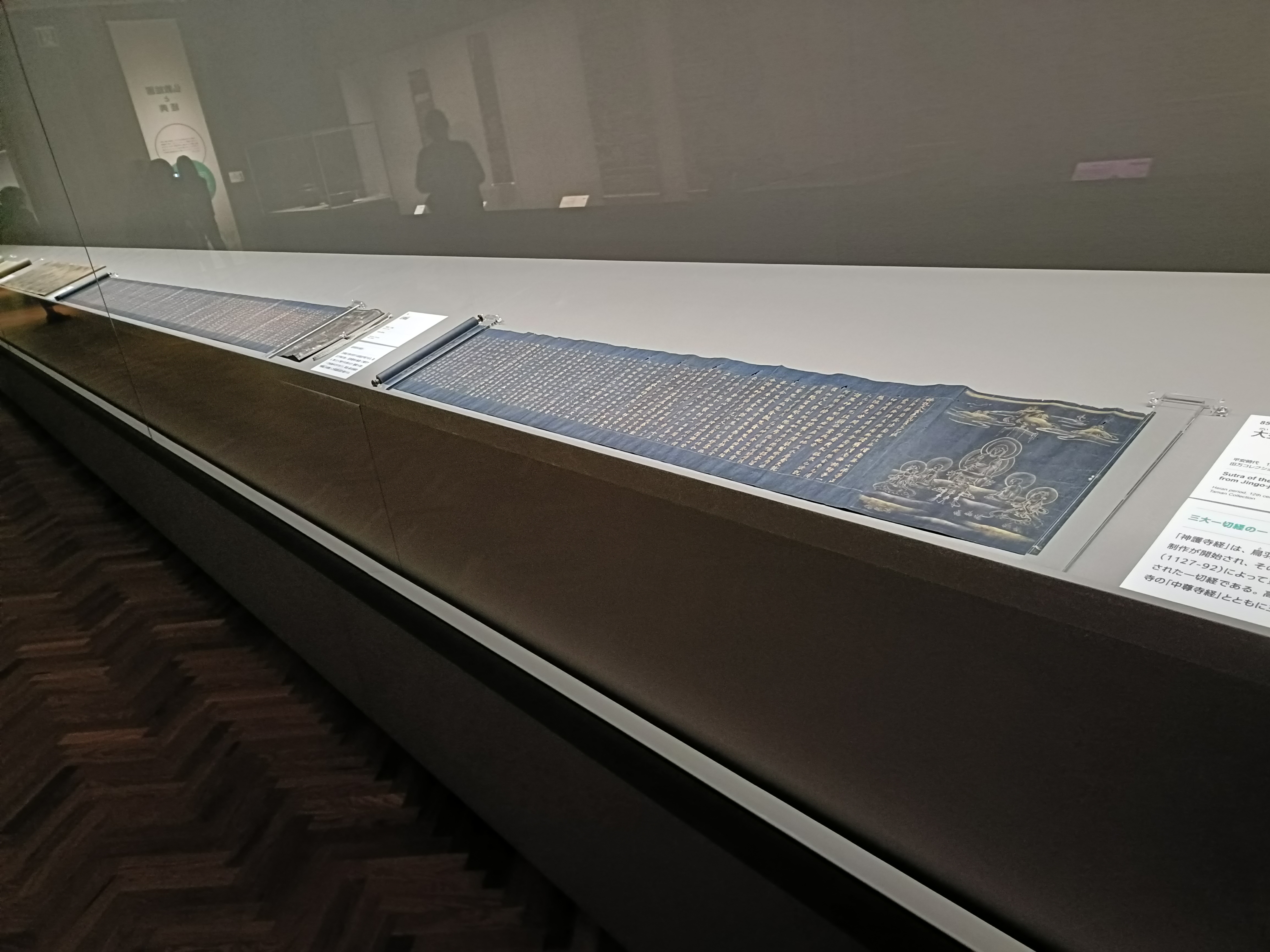 「仏教絵画と経典」では、田万コレクションを中心に、美術館随一の妖しさを誇る《荼吉尼天曼荼羅図》など多彩な仏教絵画と貴重な経典を紹介しています。特に注目すべきは《大般若経(薬師寺経)》《大金色孔雀王咒経(神護寺経)》など、奈良時代から平安時代にかけての経典。紺紙金字で書かれた《法華経》は、美術館自慢の一品で、金銀泥で描かれた華麗な見返し絵は必見です。