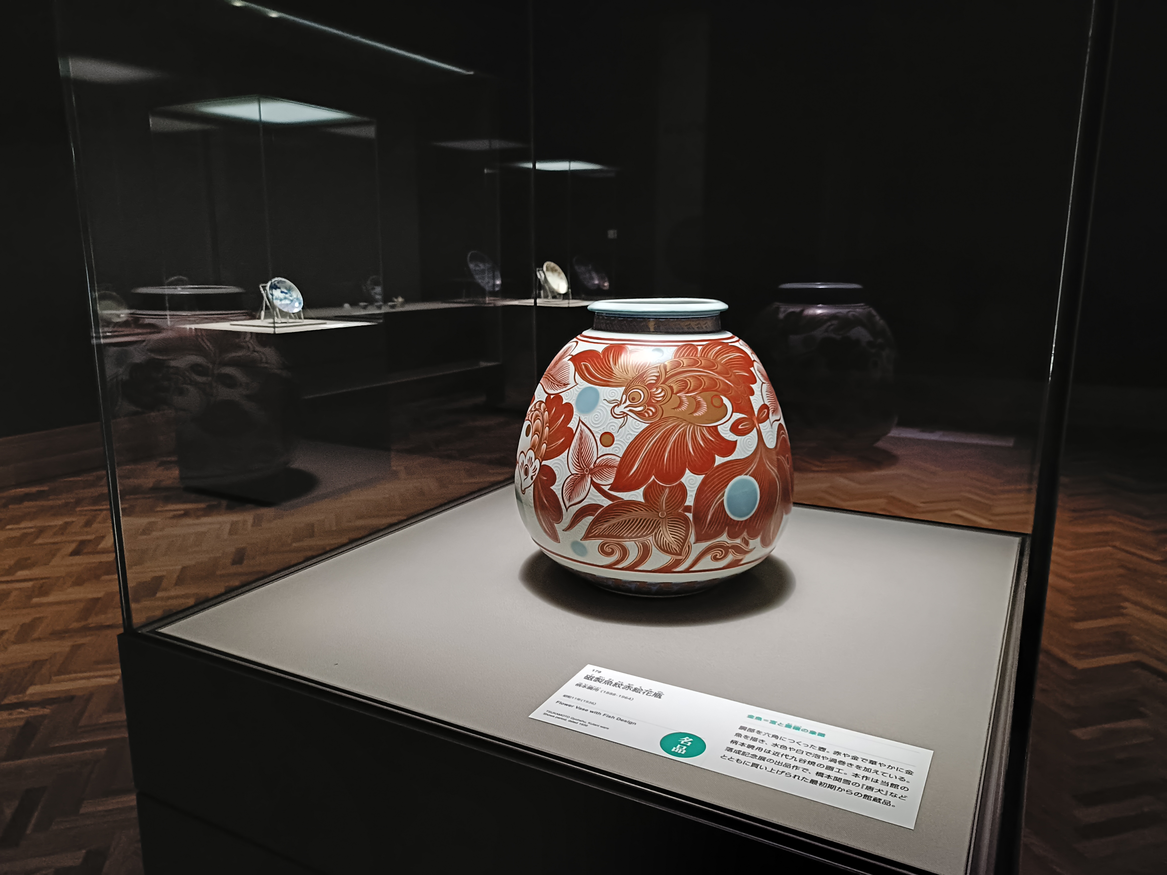 「おもてなしのうつわ」では、近世の日本陶磁を中心に、宴席や茶会で使われた器を展示しています。柄本暁舟の《磁製魚紋赤絵花瓶》は、美術館最初期からの所蔵品。金魚の躍動感が見事に表現されています。