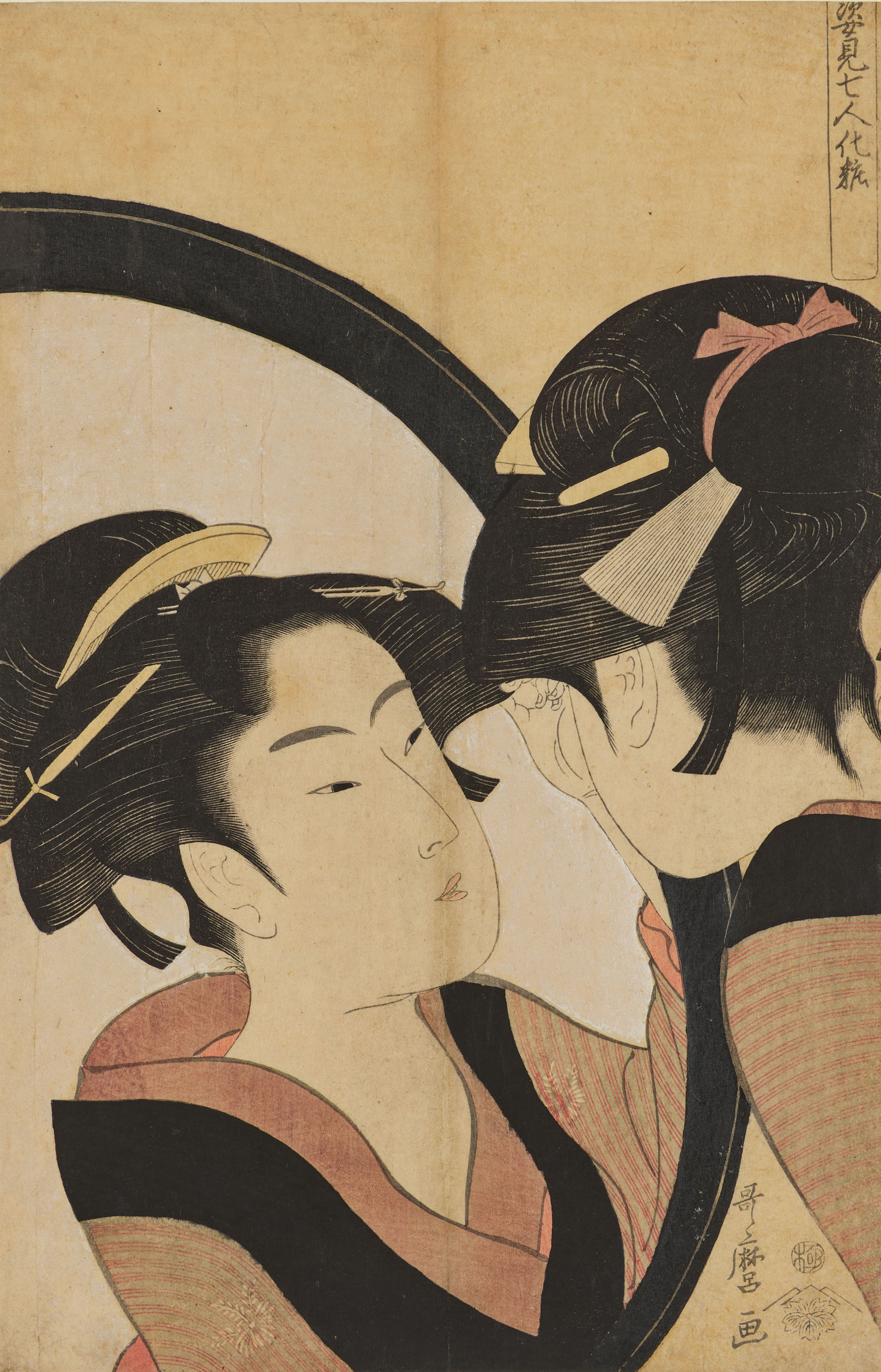 「姿見七人化粧」は、大きな鏡の前で髪を整える江戸の看板娘を描いた作品です。背景を省き黒を効果的に用いることで奥行きを演出。さらに鏡の枠を上下で幅を変えて歪ませるなど、歌麿の卓越した表現力を見ることができます。