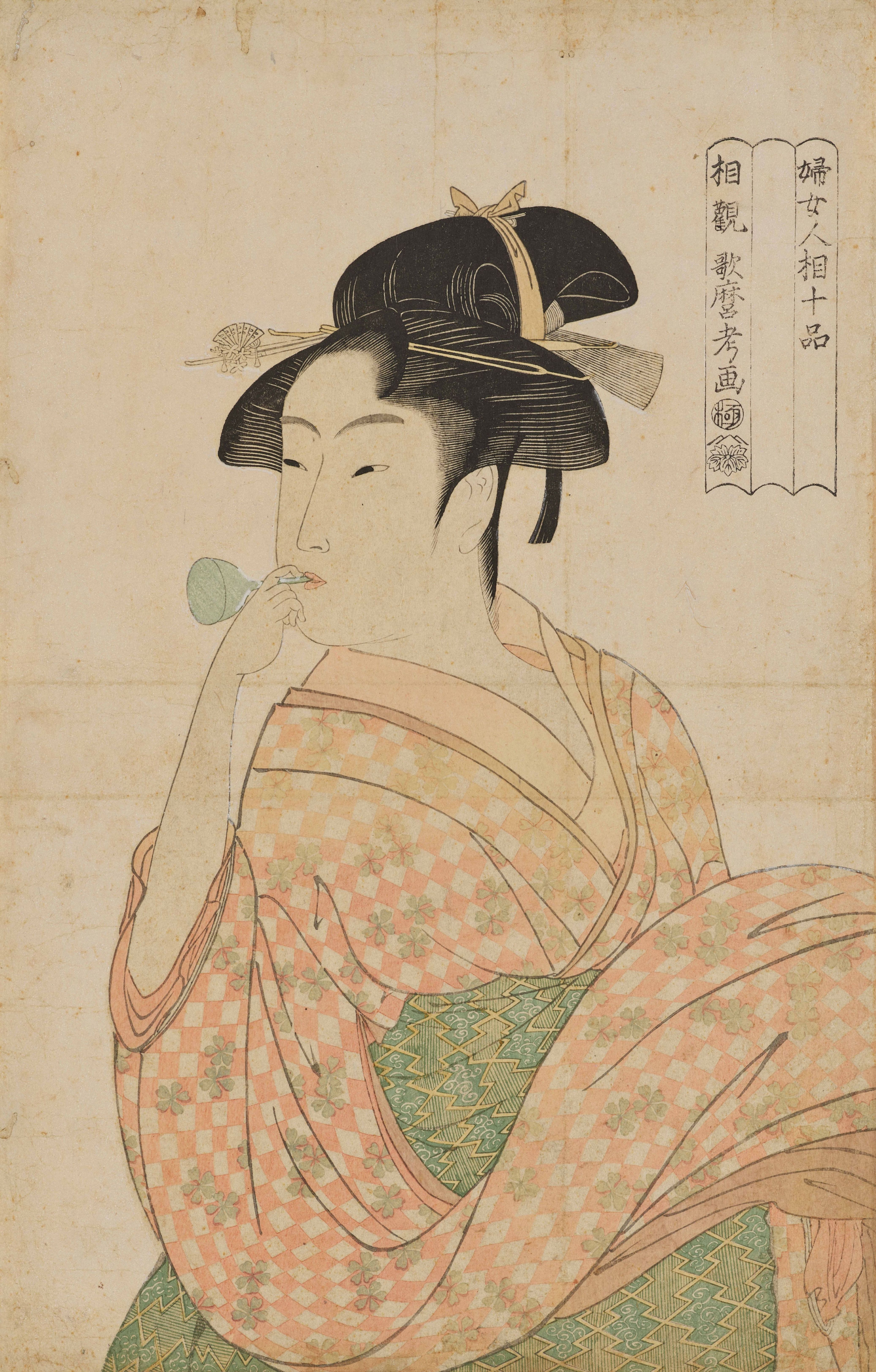 喜多川歌麿筆「婦女人相十品 ポッピンを吹く娘」大判錦絵 寛政4~5年(1792~93)頃 東京国立博物館蔵 前期展示:4/22〜5/18