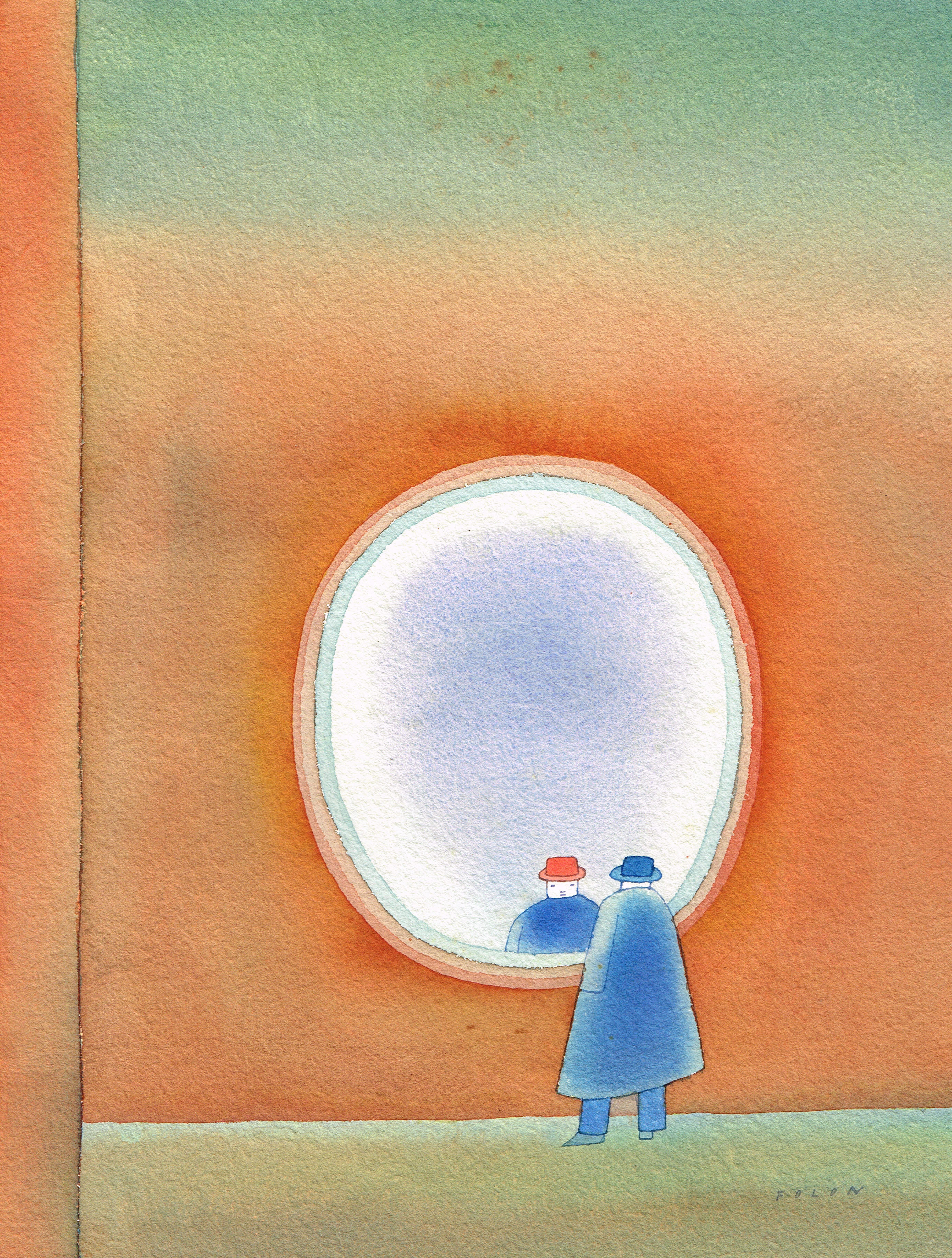 《いつもとちがう(雑誌『ザ・ニューヨーカー』表紙 原画)》1976年 フォロン財団蔵 ©Fondation Folon, ADAGP/Paris, 2024-2025